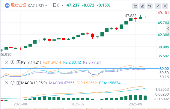白银价格在周三47.25美元左右的区间内震荡,仍接近当天创下的历史高点47.80美元。20美元左右向上倾斜的44日指数移动平均线(EMA)表明近期趋势仍然看涨。