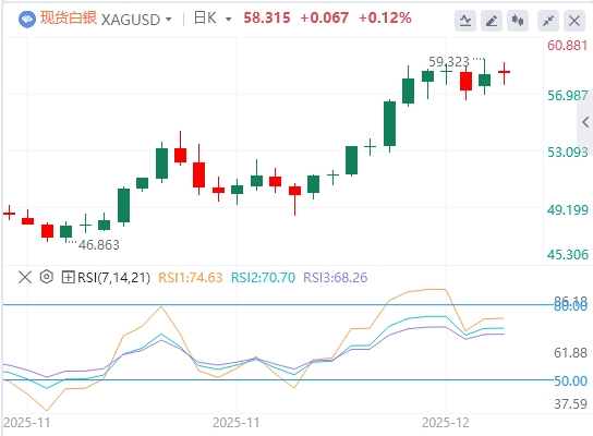 白银仍位于上升的200小时指数移动平均线56.30美元上方,支撑了更广泛的偏向。移动平均线收敛背离(MACD)转为负值,跌破零线,下行动能增强。RSI在50.82处于中性状态,预示多头动能降温。