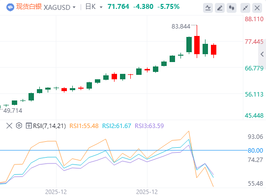 若能守住短期均线以上,则可保持上方关注,并可能在上升通道约80.00美元上方开辟阻力路径。若突破通道,银价将接近12月29日记录的85.87美元历史最高点。