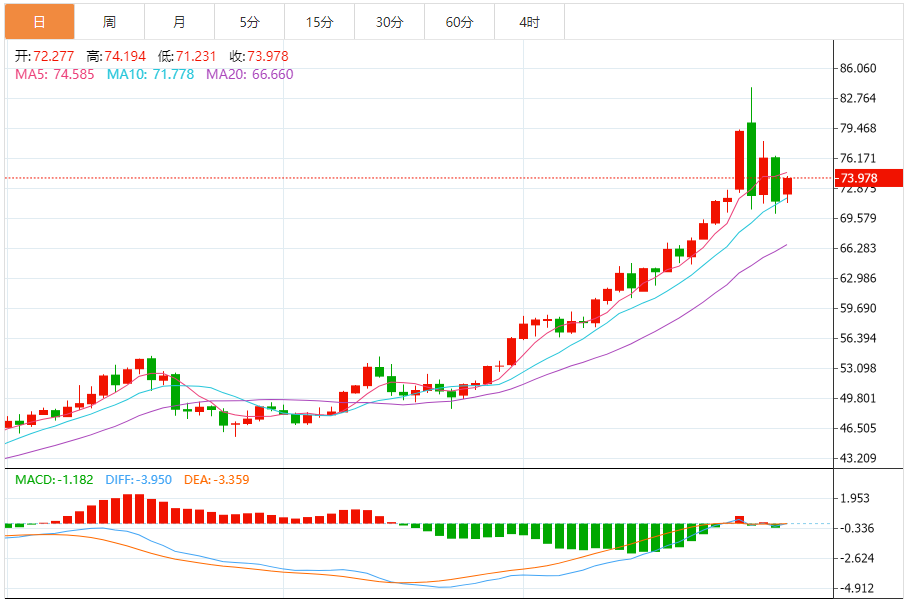 阻力位:第一阻力72.80美元/盎司(38.2%回撤位);第二阻力74.83美元/盎司(日线枢轴点第一阻力);强阻力79.06美元/盎司(日线枢轴点第二阻力)。