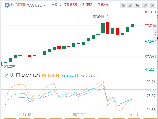 技术面上,白银的强势表现得到了多重指标的支撑。隔夜,银价成功站稳100小时简单移动平均线(SMA)上方,为多头提供了坚实的支撑基础。而周二盘中,银价更是突破了78美元这一横向阻力位,这一突破被视为多头力量增强的明确信号。移动平均收敛背离线(MACD)指标显示,MACD线位于信号线之上,且处于正值区间,直方图不断加宽,进一步印证了多头动能的强劲。