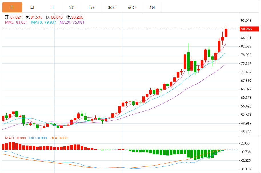 周三(1月14日),现货白银目前位于90.246美元/盎司附近,涨幅为3.83%。
