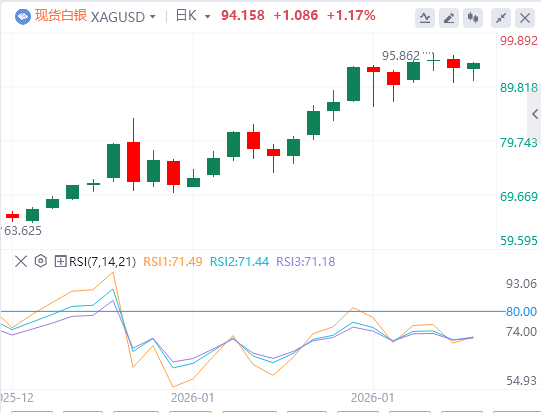 14日相对强弱指数(RSI)位于70.99,处于超买状态,存在盘整风险;而若出现回落,则可能为趋势延伸打开空间,可能暂停或回调至9天均线90.36。若跌破短期均线,将暴露上升通道约81.10美元下限,随后是50日均线72.04。