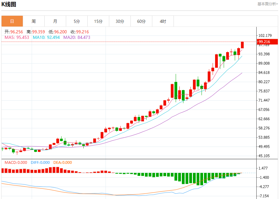 周五盘中,现货白银报99.199,涨幅3.17%。