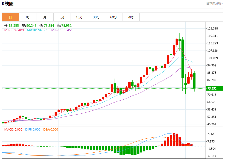 周四盘中,现货白银报76.086,跌幅13.55%。