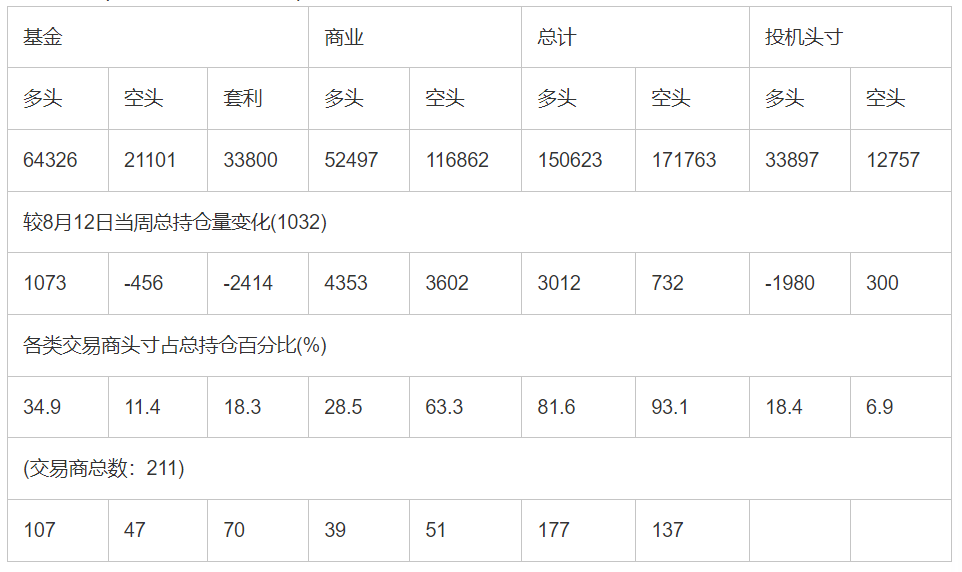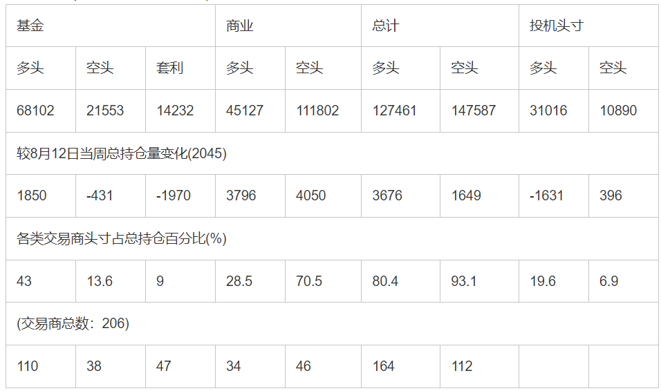 截止8月19日当周COX(纽约商品期货交易所)白银期货分类持仓报告: 合约单位:(5000金衡盎司的合同)总持仓量:158477
