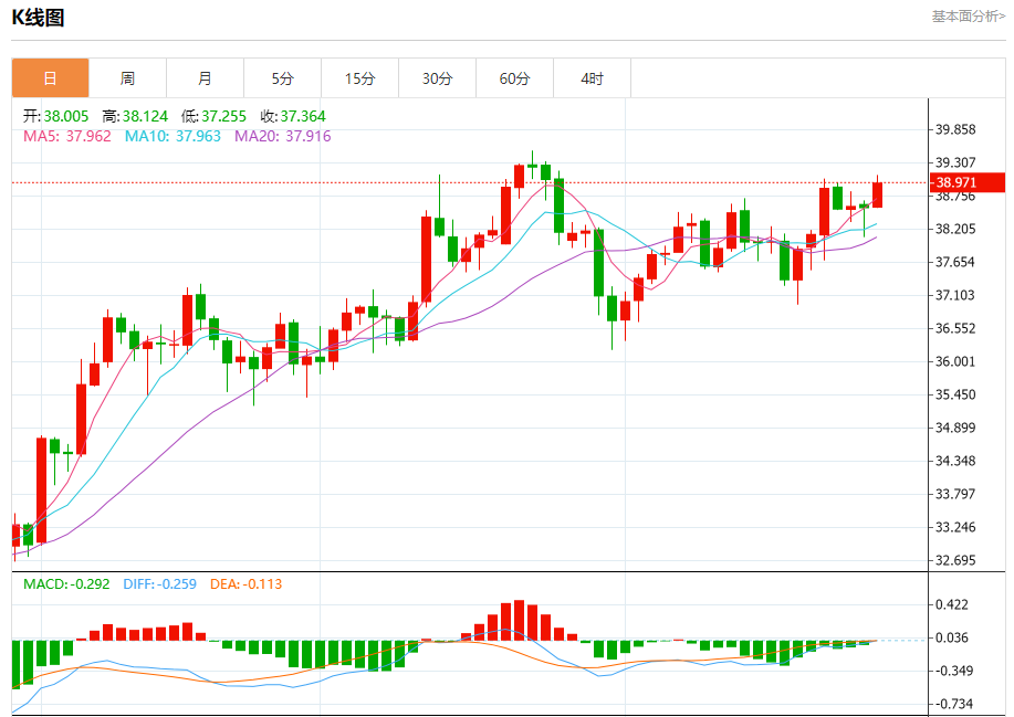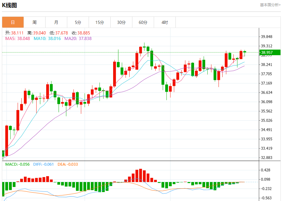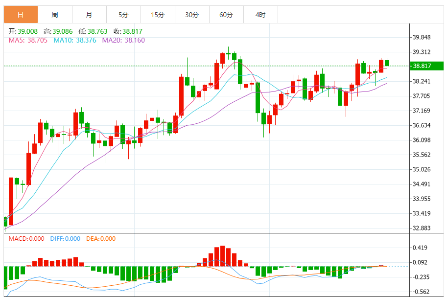周四盘中,现货白银报38.951,涨幅1.01%。 今日分析:在38.35之上,看涨,目标价位为38.85,然后为39.05。 技术点评:RI技术指标上,看涨。 支撑位:38.3538.1537.95 阻力位:39.2539.0538.85 (亚汇网编辑:冰凡)