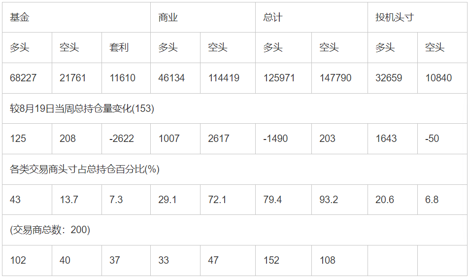 截止8月26日当周COX(纽约商品期货交易所)白银期货分类持仓报告: 合约单位:(5000金衡盎司的合同)总持仓量:158630
