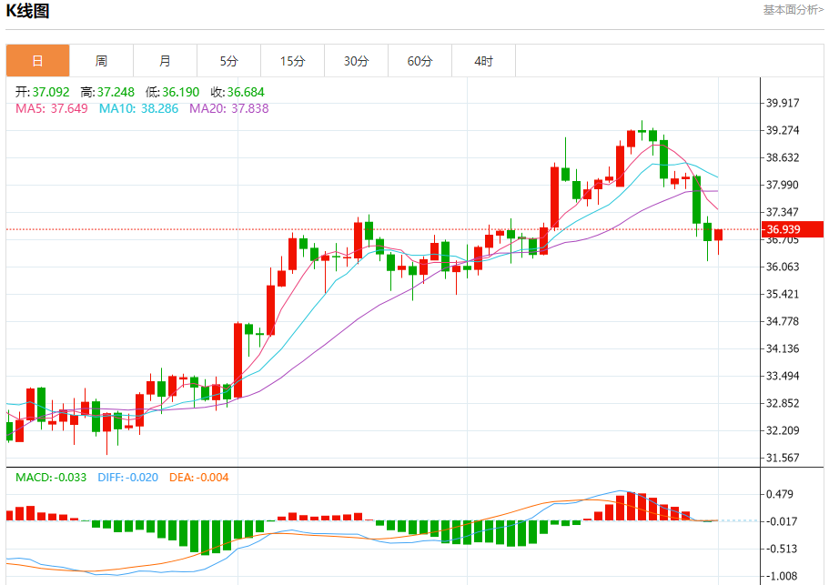 周五盘中,现货白银报36.925,涨幅0.66%。 今日分析:在36.80之下,看跌,目标价位为36.40,然后为35.80。 技术点评:只要依旧存在36.80阻力位,价格波动存在看跌的趋势。 支撑位:36.4035.8035.50 阻力位:37.2537.0036.80 (亚汇网编辑:冰凡)