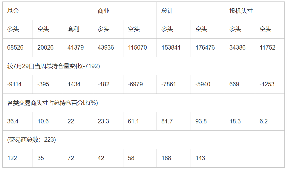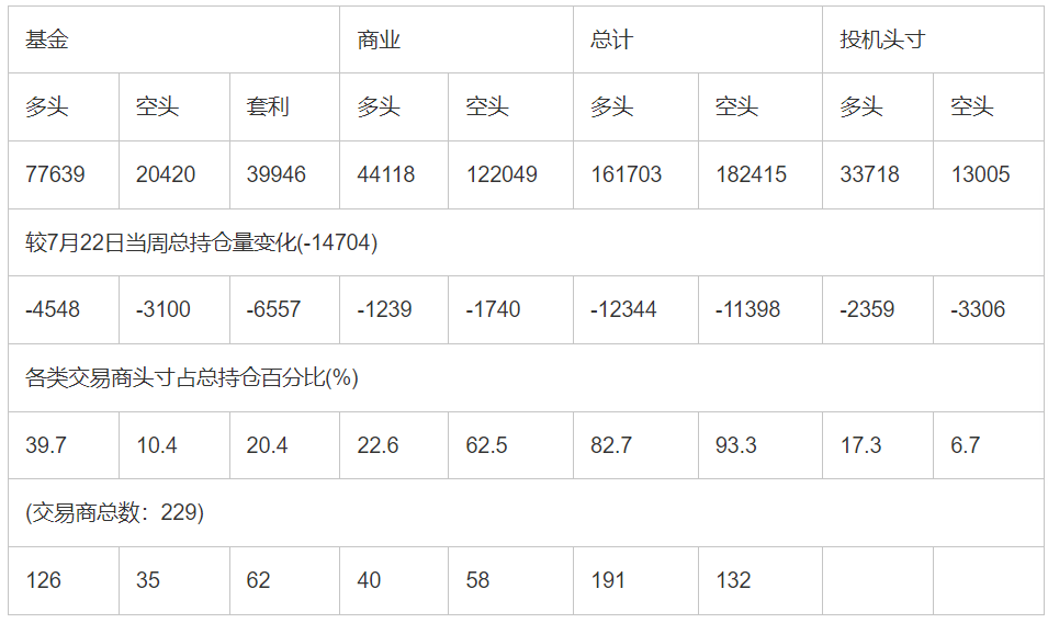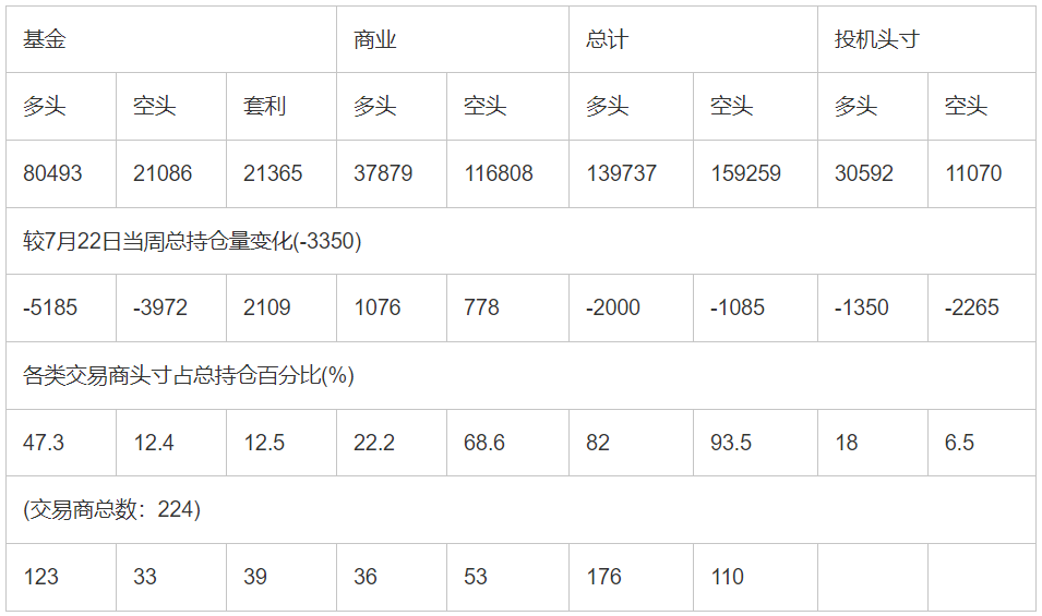 截止7月29日当周COX(纽约商品期货交易所)白银期货和期权分类持仓报告: 合约单位:(5000金衡盎司的合同)总持仓量:195420