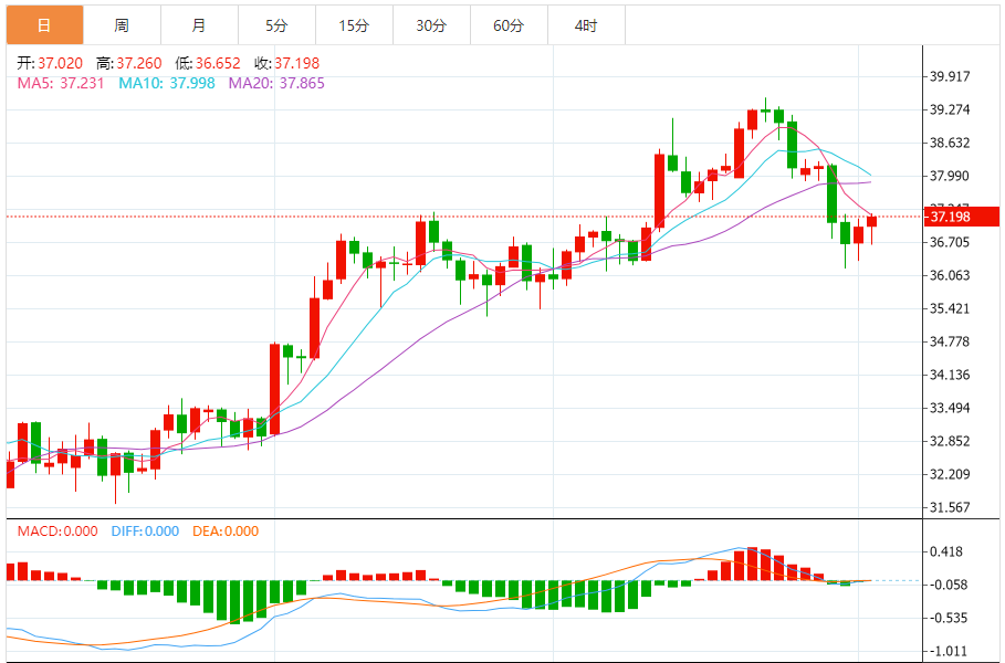 8月4日,周一亚市盘中,白银难以利用周五温和的复苏涨幅,并在新的一周开始时在区间内震荡,因为受美国非农就业数据影响的美元(UD)抛售现在似乎已经减弱。白银目前交投于37.00美元大关附近,距离上周四触及的四周低点仅一步之遥。 从技术角度来看,本周跌破近两个月的上升通道支撑位,该支撑位与200小时图上的4周期简