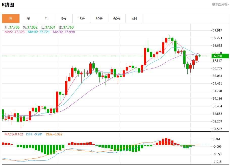 周四盘中,现货白银报38.240,涨幅1.16%。 今日分析:在37.90之上,看涨,目标价位为38.60,然后为38.90。 技术点评:RI技术指标看涨,有进一步上升空间。 支撑位:37.9037.6537.50 阻力位:39.0538.9038.60 (亚汇网编辑:冰凡)