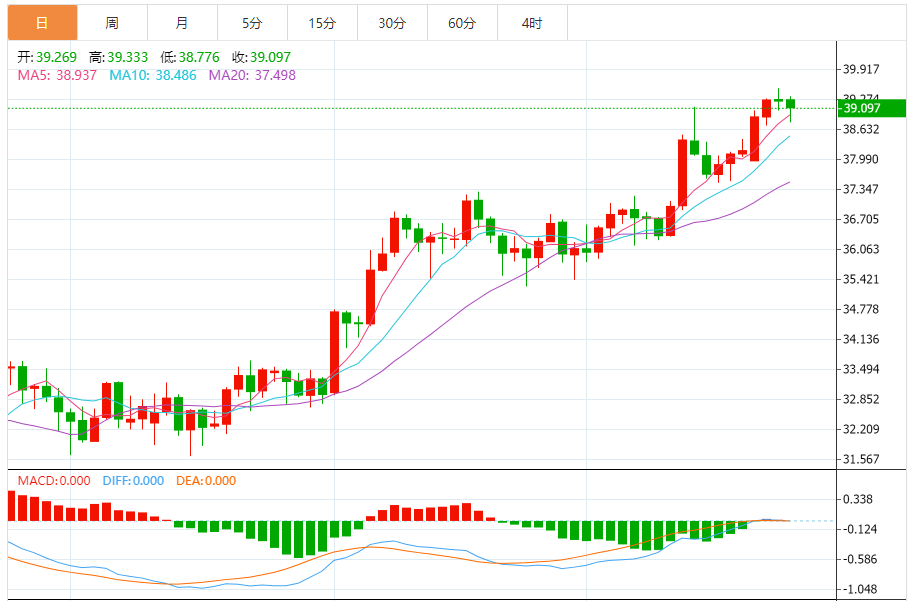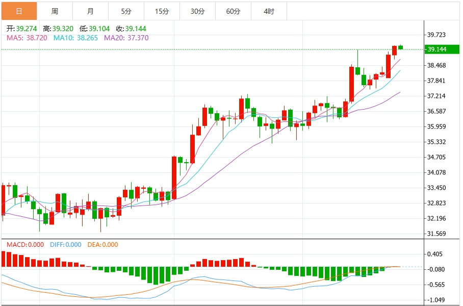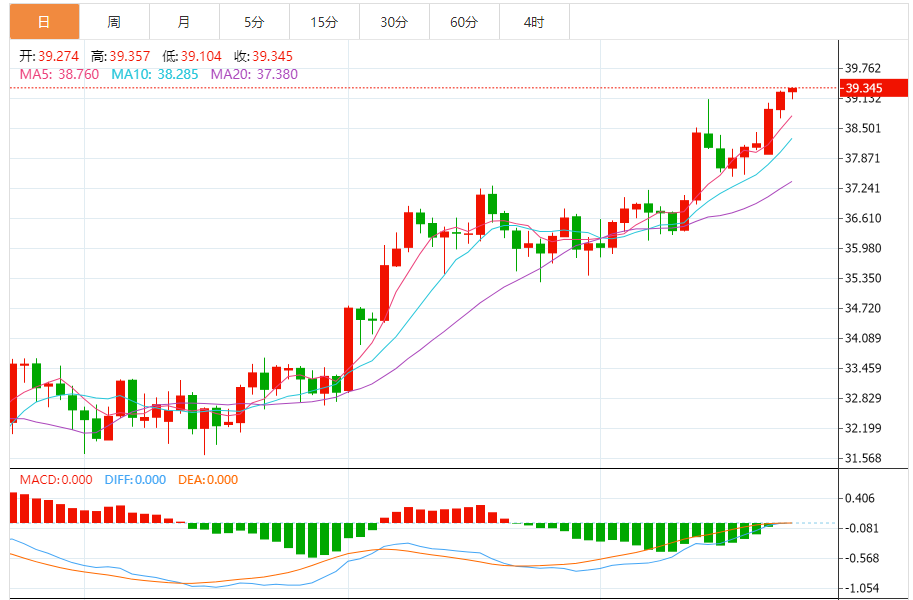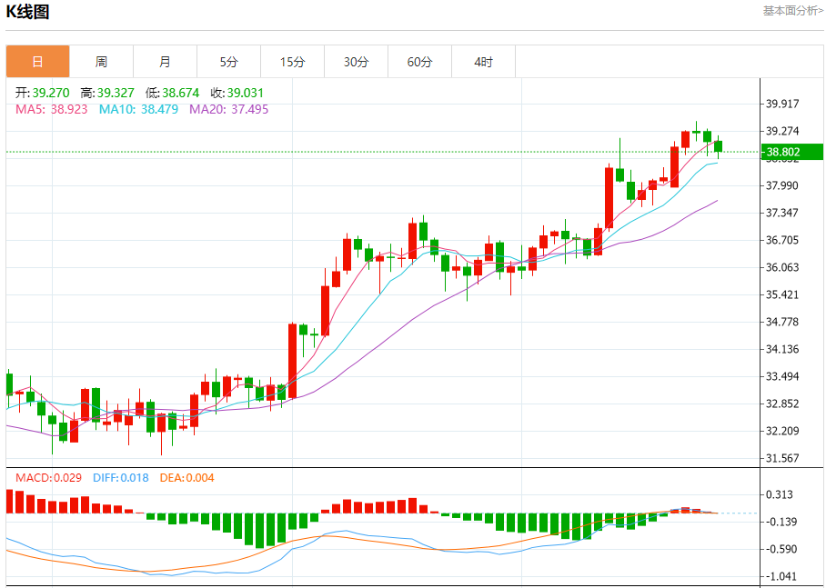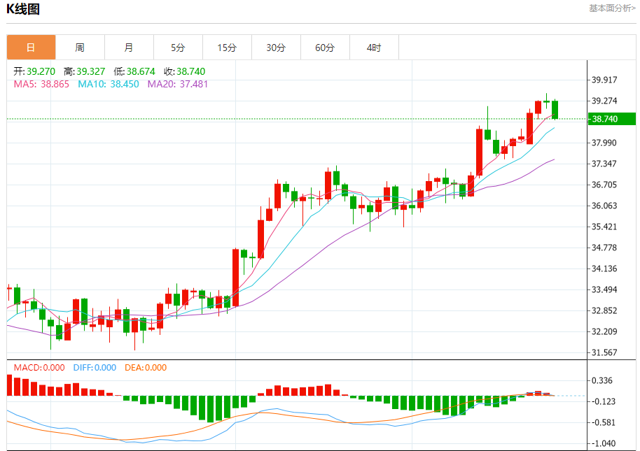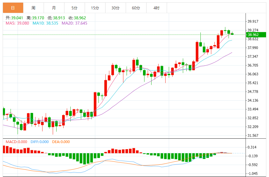 周二盘中,现货白银报39.010,涨幅0.28%。 今日分析:在38.65之上,看涨,目标价位为39.05,然后为39.25。 技术点评:超短线(当日内)技术指标运行趋势复杂,应谨慎操作。 支撑位:38.6538.4038.05 阻力位:39.4539.2539.05 (亚汇网编辑:冰凡)