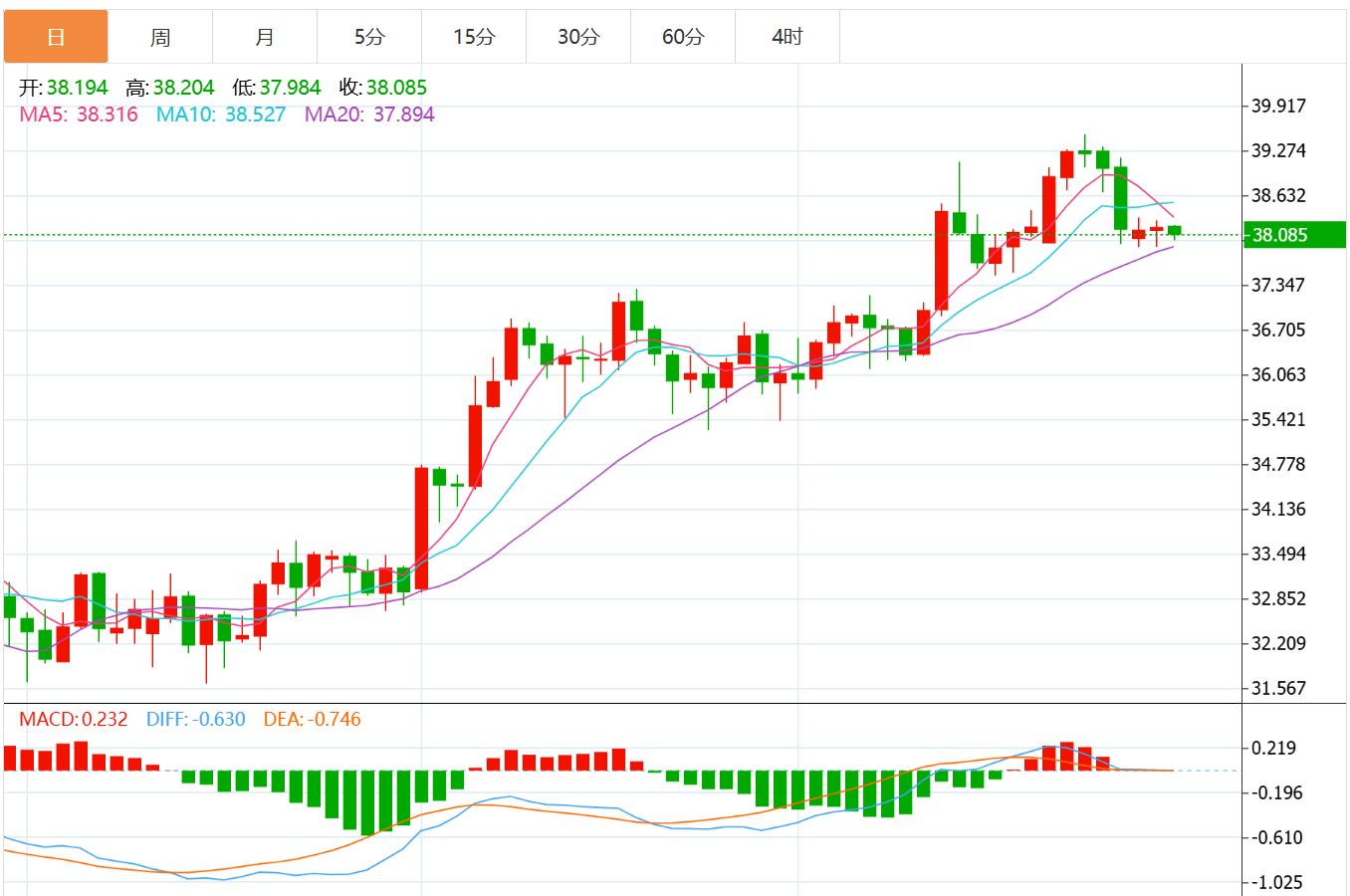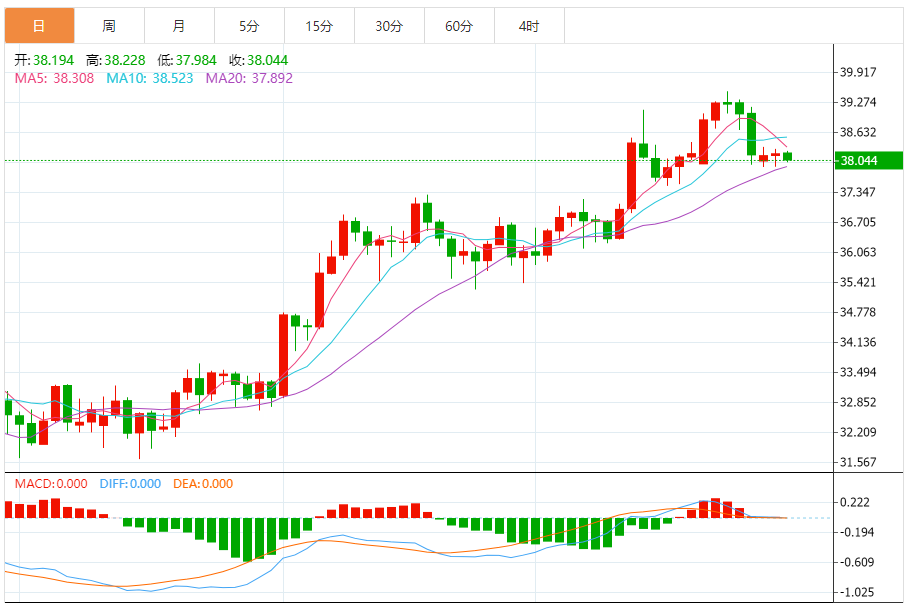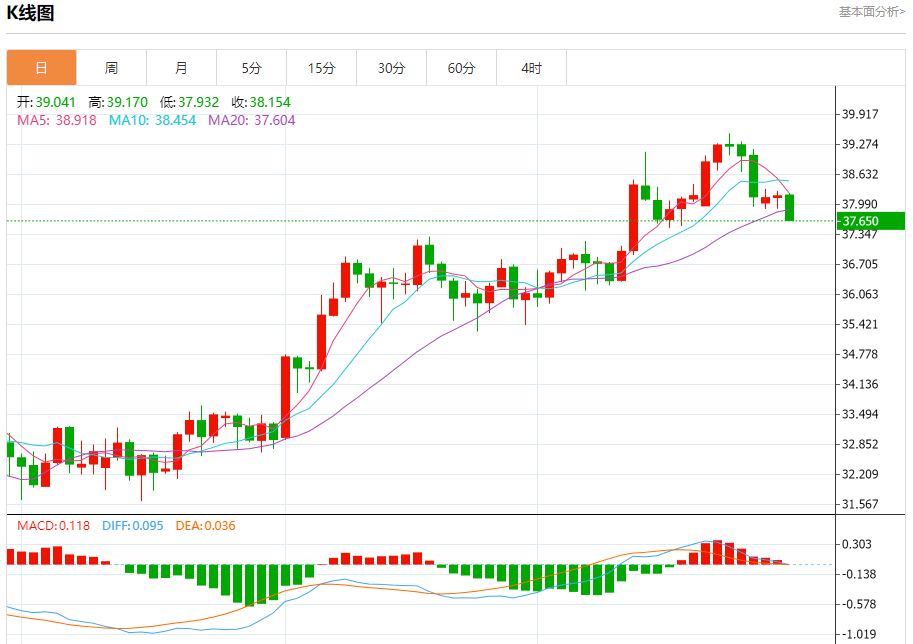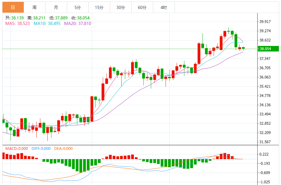 周二盘中,现货白银报39.010,涨幅0.28%。 今日分析:在38.65之上,看涨,目标价位为39.05,然后为39.25。 技术点评:超短线(当日内)技术指标运行趋势复杂,应谨慎操作。 支撑位:38.6538.4038.05 阻力位:39.4539.2539.05 (亚汇网编辑:冰凡)