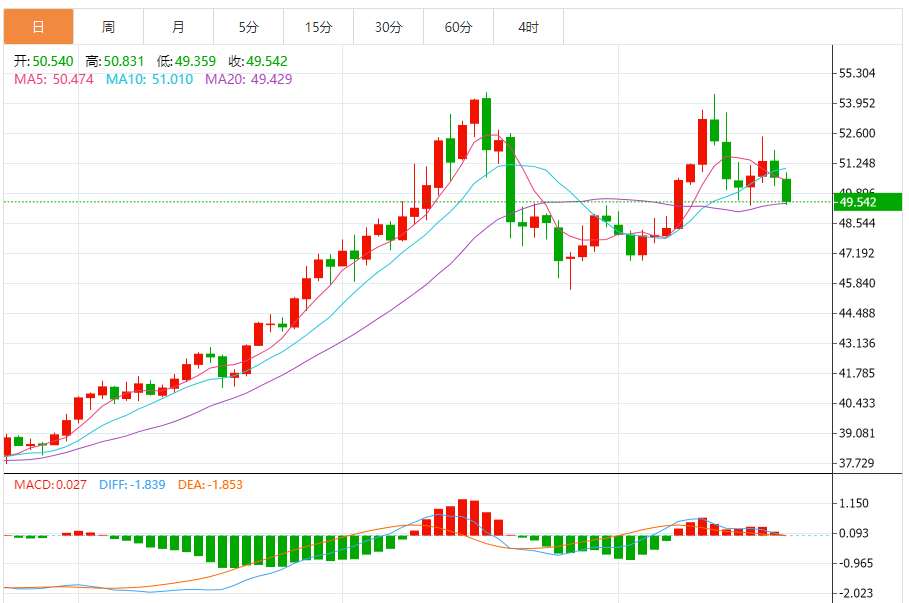 周一亚盘,白银(XAG/UD)在新一周的第一天努力利用周五从48.65-48.60美元区域的温和反弹,或接近两周低点,并吸引新的卖盘。该白色金属目前交易于49.80美元附近,当日下跌近0.30%,似乎面临进一步下滑的风险。 白银技术走势分析 从技术角度来看,XAG/UD在4小时图上显示出在上升的200期指数移动平均线(A)下的一些