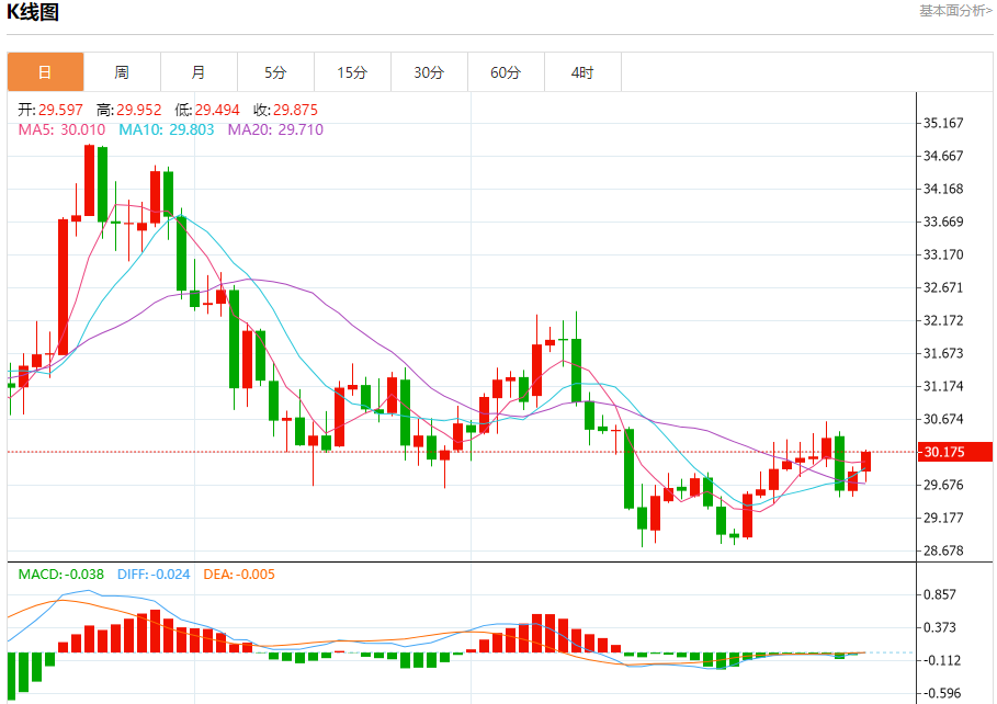 周四盘中,现货白银报30.110,跌幅2.21%。 今日分析:在30.70之下,看跌,目标价位为30.35,然后为30.17。 技术点评:跌破30.70,为空头信号,向下的目标将会是30.35。 支撑位:30.3530.1730.09 阻力位:31.2030.9830.70 (亚汇网编辑:冰凡)