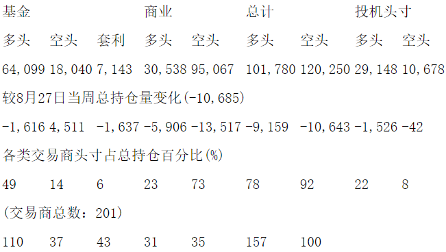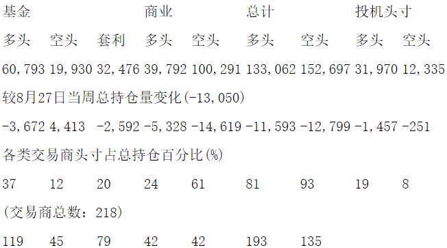 美国商品期货交易委员会(CFTC)最新公布截止9月3日当周COX白银期货分类持仓报告: 合约单位:5000金衡盎司总持仓量:130928