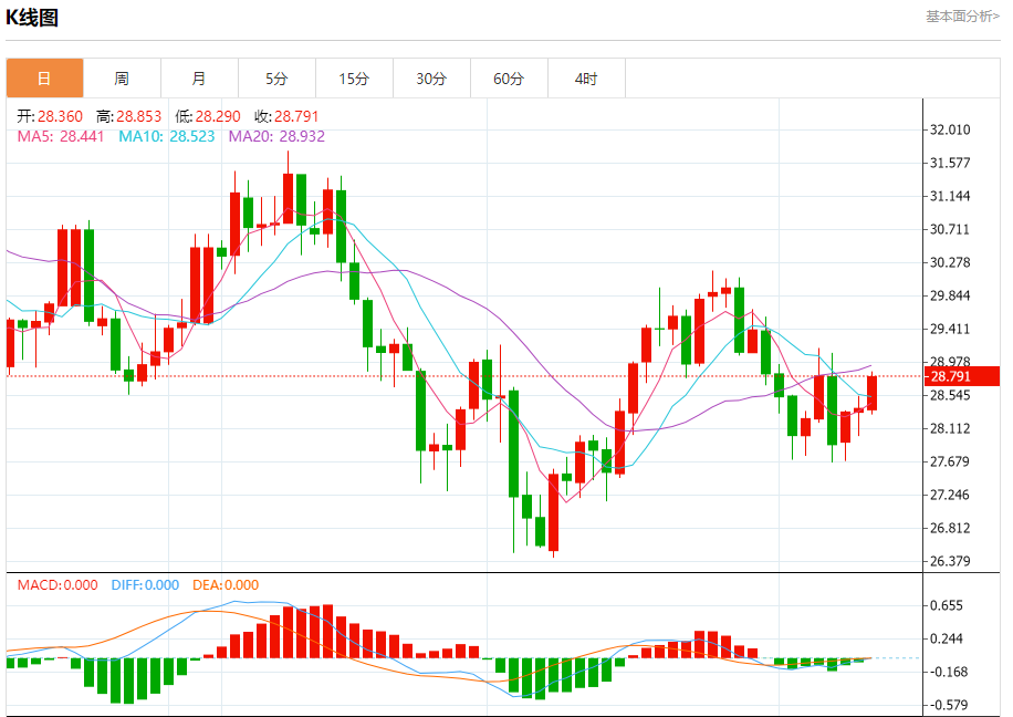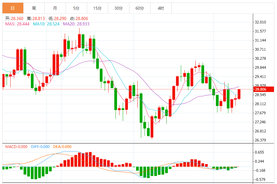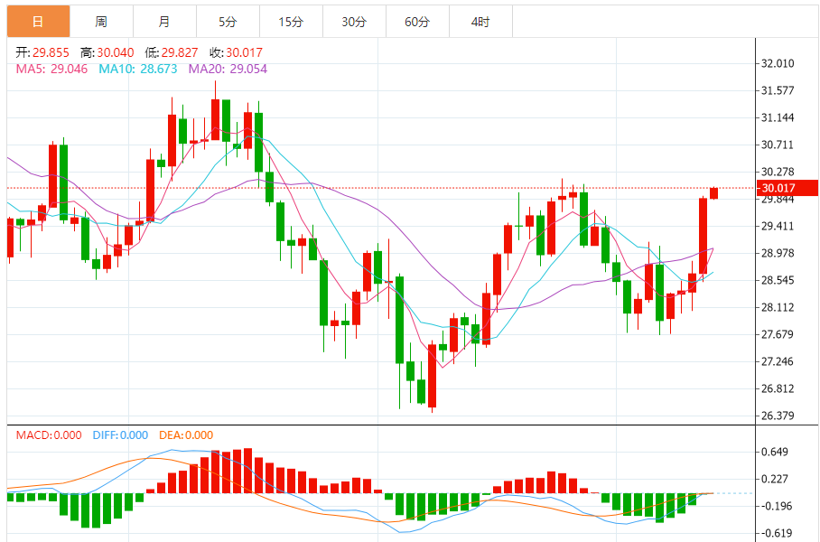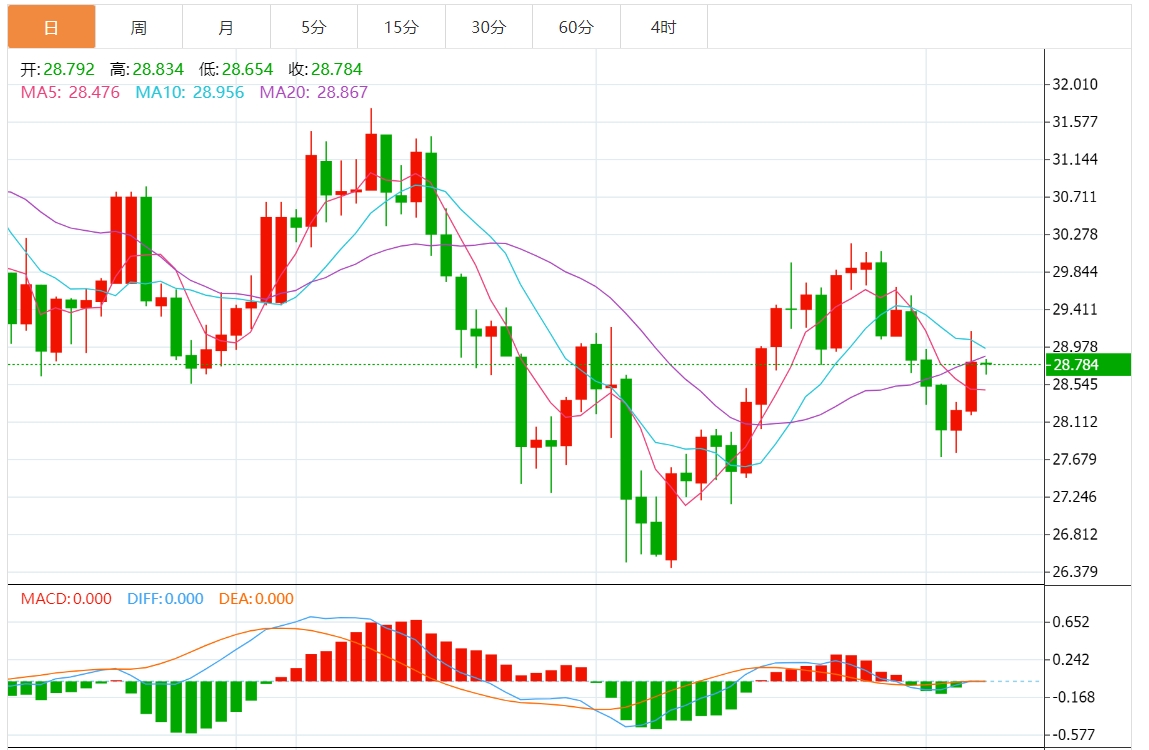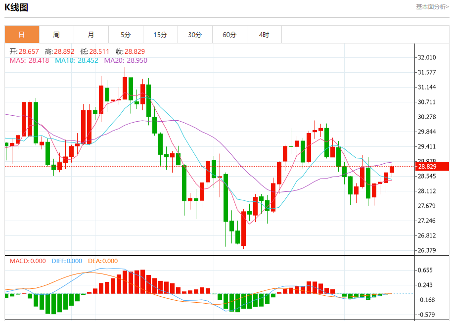 周四盘中,现货白银报28.764,涨幅0.39%。 今日分析:在28.50之上,看涨,目标价位为29.05,然后为29.30。 技术点评:在28.50之上,为多头信号,向上的目标位为29.05。 支撑位:28.5028.3028.15 阻力位:29.6029.3029.05 (亚汇网编辑:冰凡)