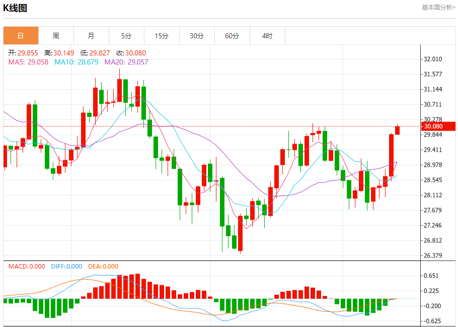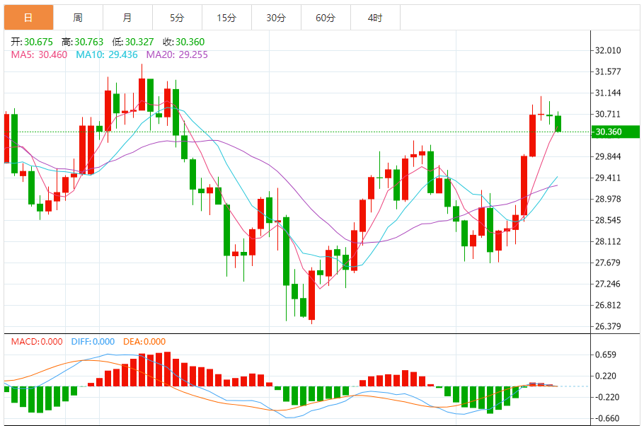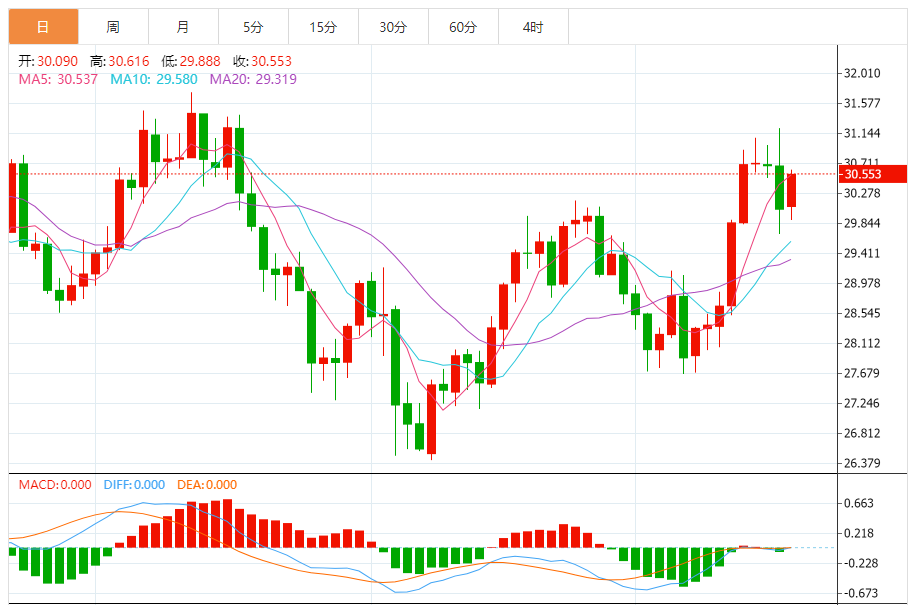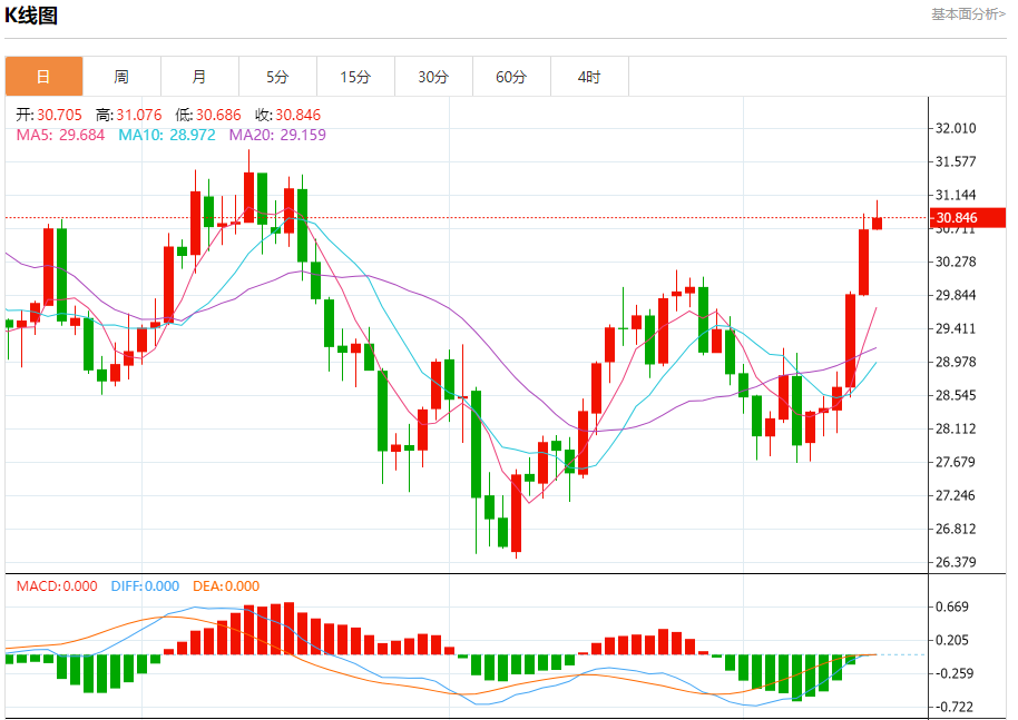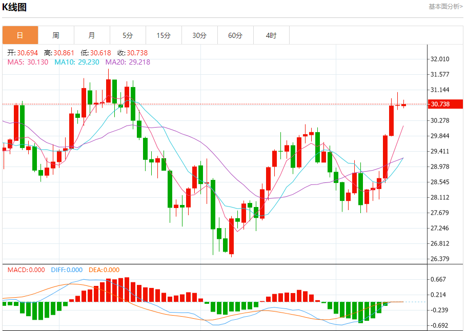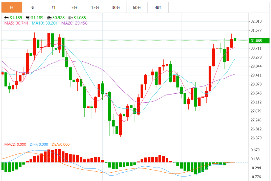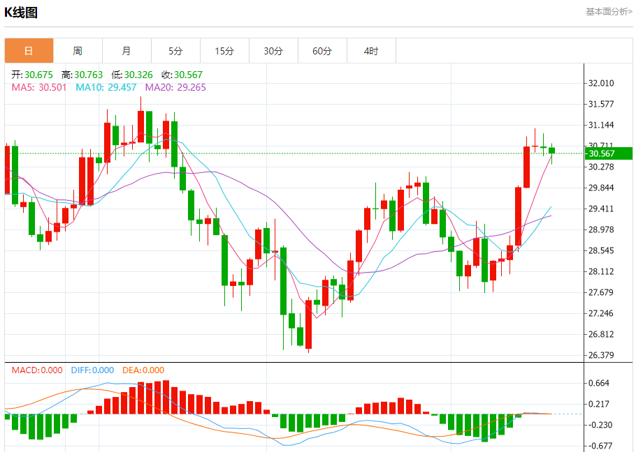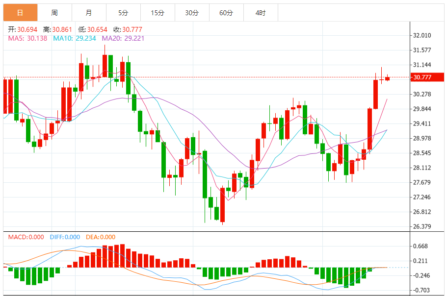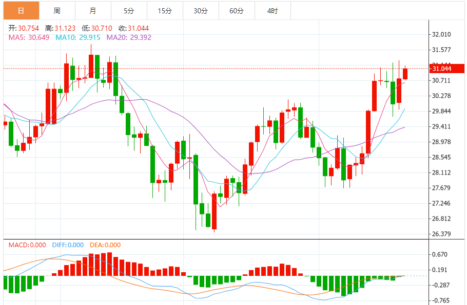 周四盘中,现货白银报31.169,涨幅3.73%。 今日分析:在30.77之上,看涨,目标价位为31.29,然后为31.70。 技术点评:其即时趋势维持向上,有较强的动能。 支撑位:30.7730.5330.32 阻力位:32.2031.7031.29 (亚汇网编辑:冰凡)
