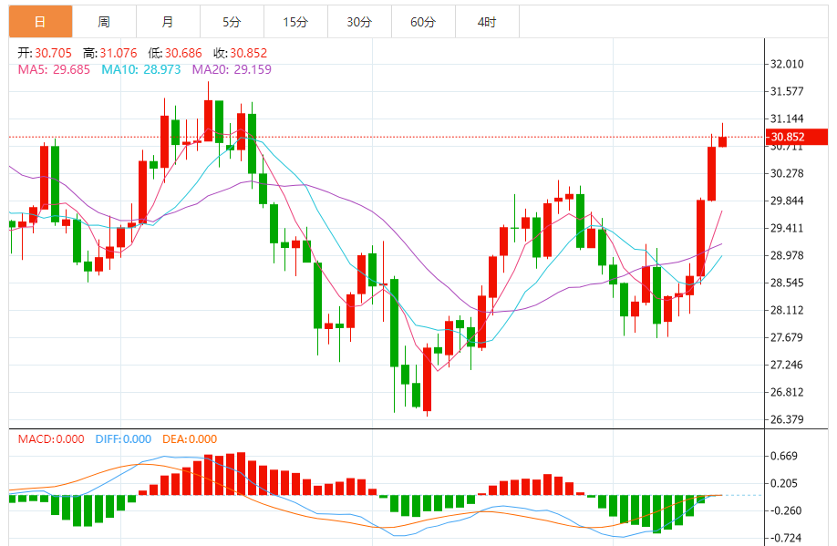 周一(9月16日),现货白银目前位于30.858美元/盎司,涨幅为0.53%。白银价格强势突破30.06美元水平,成功实现31.00美元的扩展目标,我们认为超越这一水平的道路是开放的,以在日内和短期基础上实现更多收益,走向31.70美元区域作为下一个主站。 因此,在接下来的一段时间内,积极的情景仍将继续,注意31.00美元水