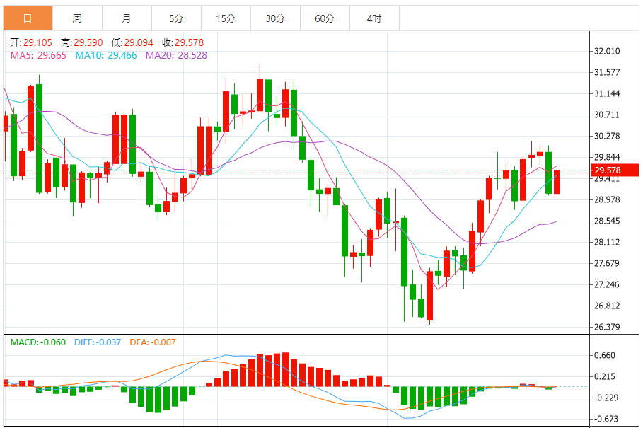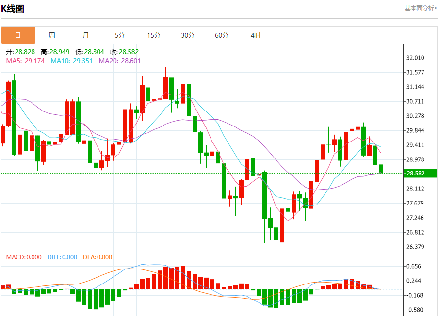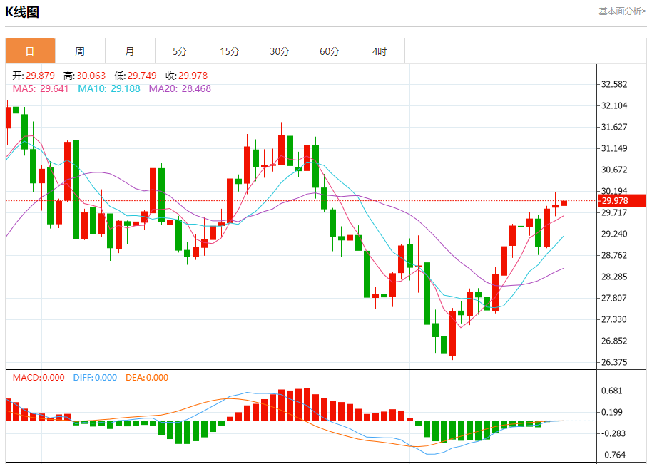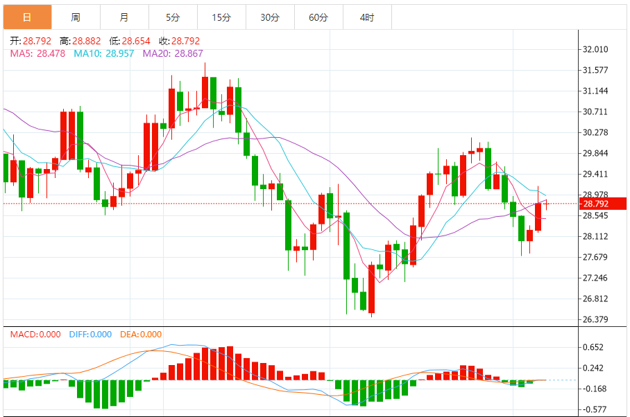 周五盘中,现货白银报28.946,涨幅0.50%。 今日分析:在28.60之上,看涨,目标价位为29.11,然后为29.30。 技术点评:在28.60之上,为多头信号,向上的目标位为29.11。 支撑位:28.6028.4028.17 阻力位:29.6029.3029.11 (亚汇网编辑:冰凡)