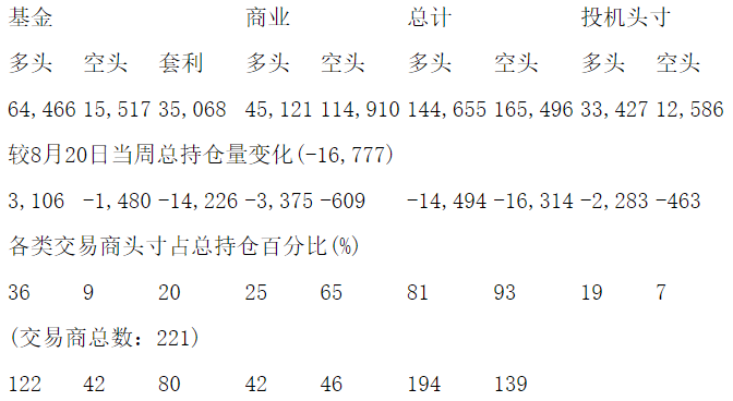 美国商品期货交易委员会(CFTC)最新公布截止8月27日当周COX白银期货和期权分类持仓报告: 合约单位:5000金衡盎司总持仓量:178082