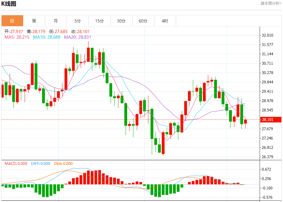 周一盘中,现货白银报28.201,涨幅1.06%。 今日分析:在28.20之下,看跌,目标价位为27.65,然后为27.40。 技术点评:只要28.20阻力位不被突破,向下跌破27.65位置的风险很高。 支撑位:27.6527.4027.15 阻力位:28.8028.5528.20 (亚汇网编辑:冰凡)
