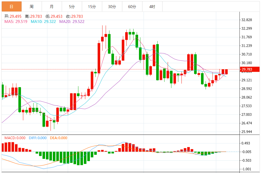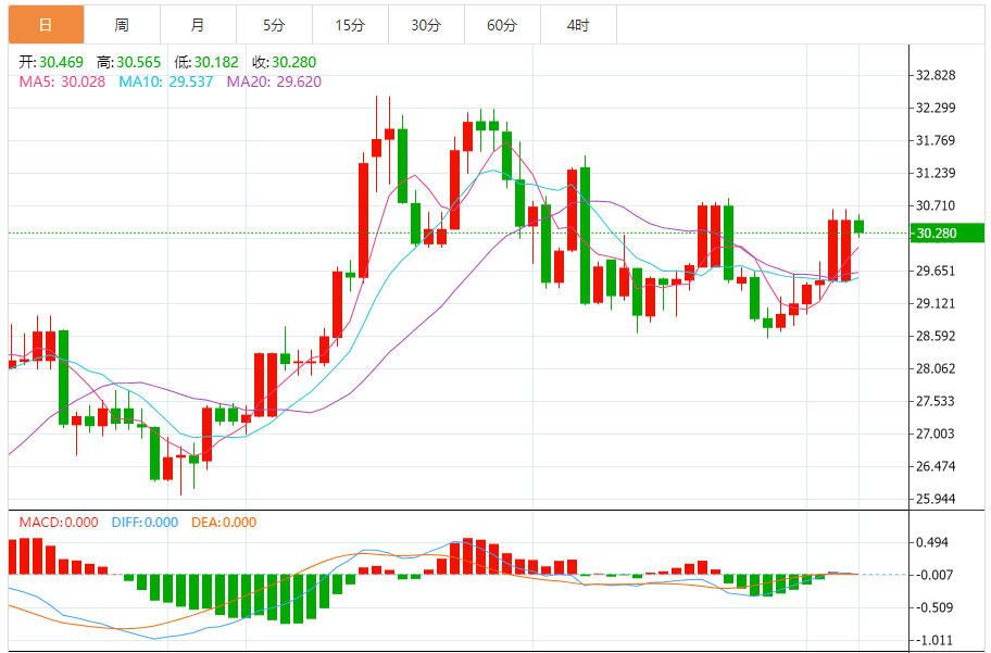 周四亚盘,白银走低,并侵蚀了前一天的部分强劲涨幅,跌至30.65-30.70美元区域,或近两周来的最高水平。白色金属目前在30.40美元区域附近交易,当日下跌0.35%,目前似乎已经结束了连续五天的上涨,尽管近期技术设置似乎倾向于看涨交易者。 白银技术走势分析 白银最近在28.80-28.70美元水平阻力位断点转为支撑位下方