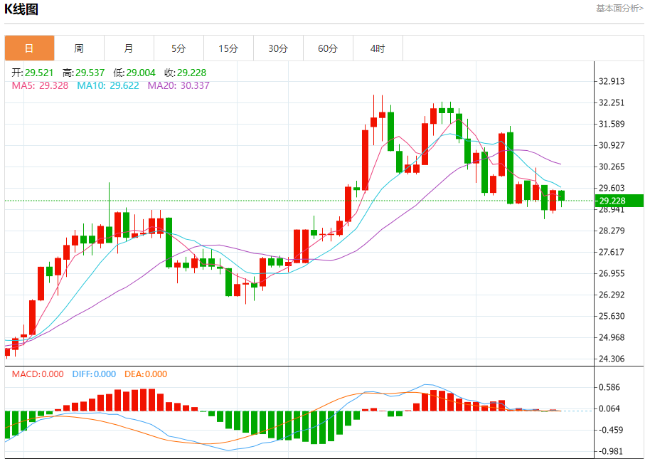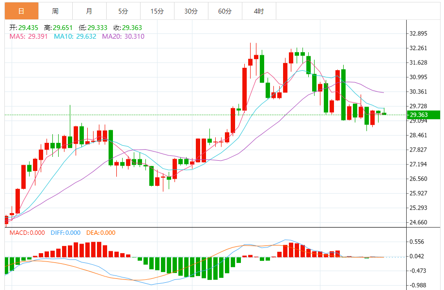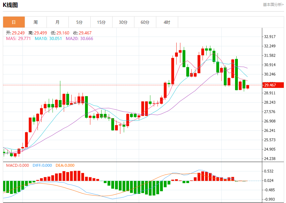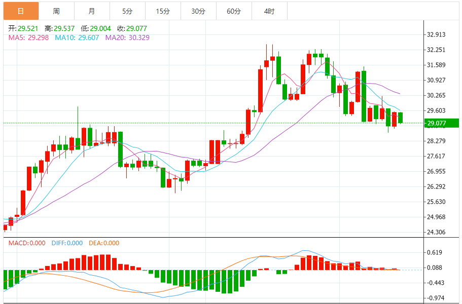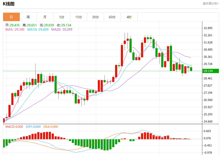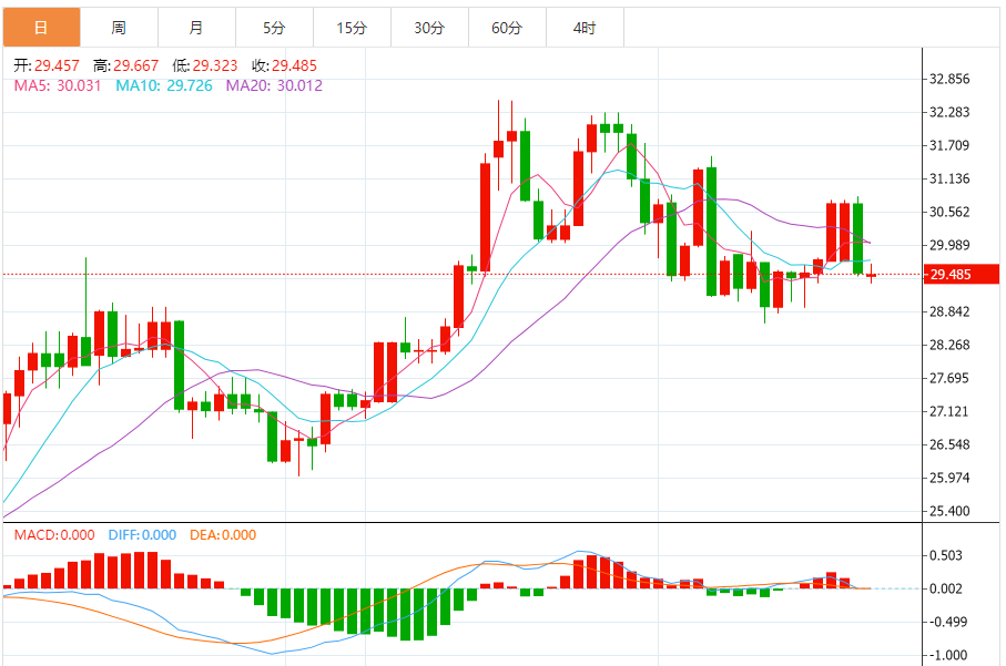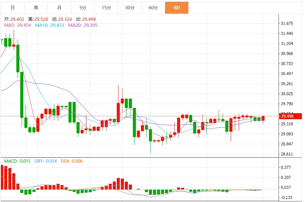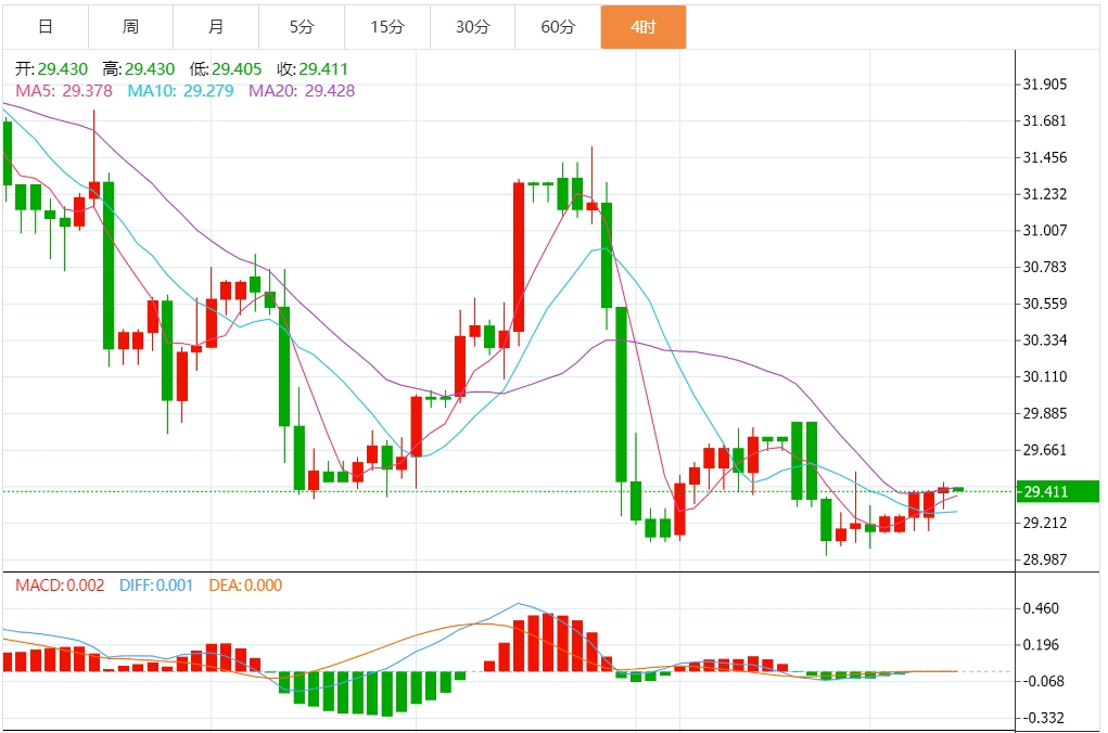 周一盘中,现货白银报29.224,跌幅1.04%。 今日分析:在29.37之下,看跌,目标价位为28.85,然后为28.65。 技术点评:跌破29.37,为空头信号,向下的目标将会是28.85。 支撑位:28.8528.6528.45 阻力位:29.7229.5729.37 (亚汇网编辑:冰凡)