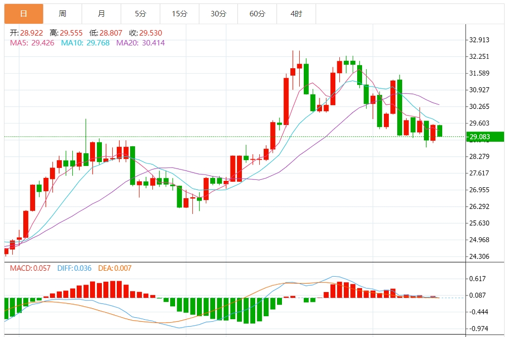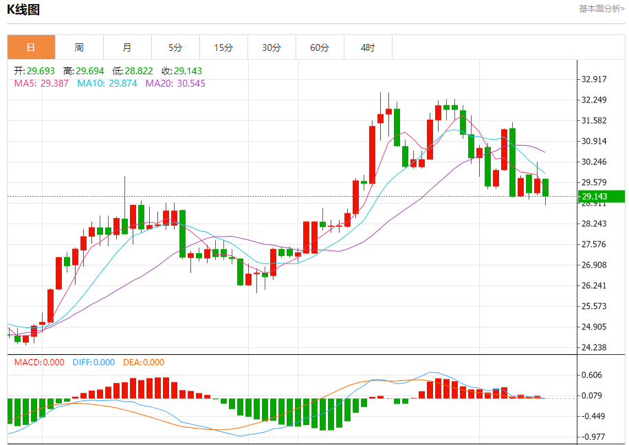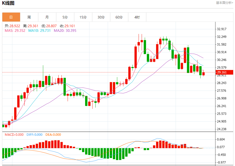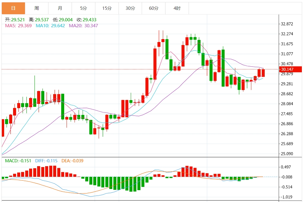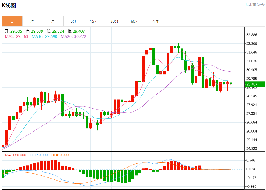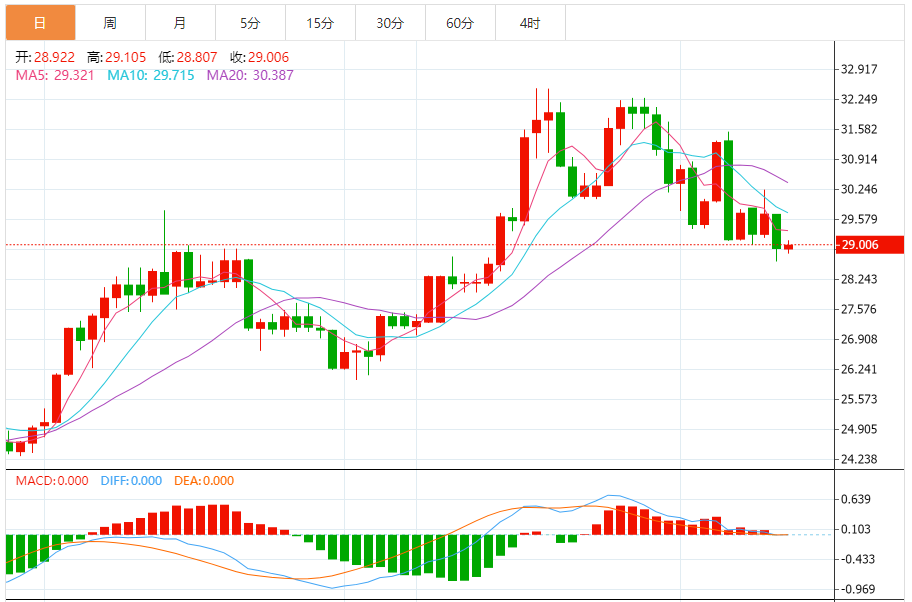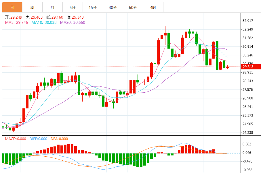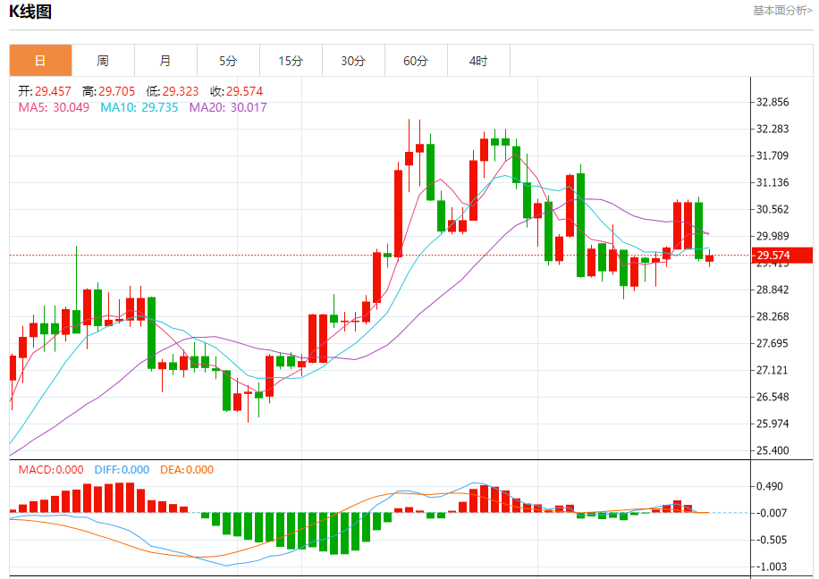 周一盘中,现货白银报29.224,跌幅1.04%。 今日分析:在29.37之下,看跌,目标价位为28.85,然后为28.65。 技术点评:跌破29.37,为空头信号,向下的目标将会是28.85。 支撑位:28.8528.6528.45 阻力位:29.7229.5729.37 (亚汇网编辑:冰凡)