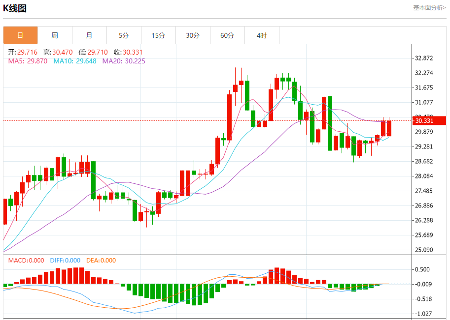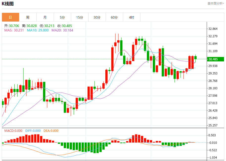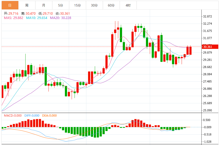 周四盘中,现货白银报30.357,涨幅2.05%。 今日分析:在30.08之上,看涨,目标价位为30.60,然后为30.80。 技术点评:在30.08之上,为多头信号,向上的目标位为30.60。 支撑位:30.0829.9029.65 阻力位:31.0030.8030.60 (亚汇网编辑:冰凡)