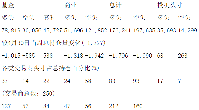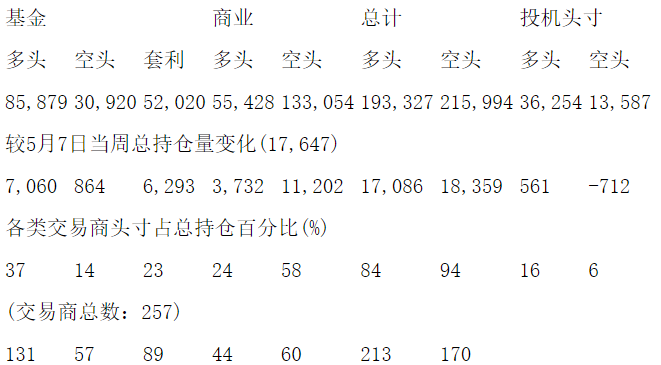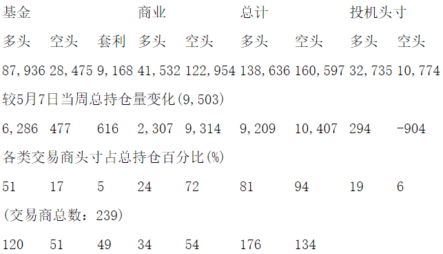 美国商品期货交易委员会(CFTC)最新公布截止5月7日当周COX白银期货和期权分类持仓报告: 合约单位:5000金衡盎司总持仓量:211935