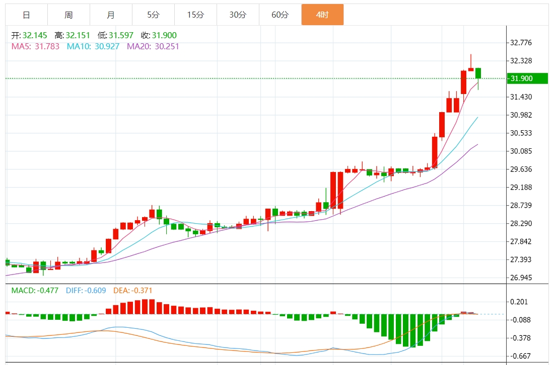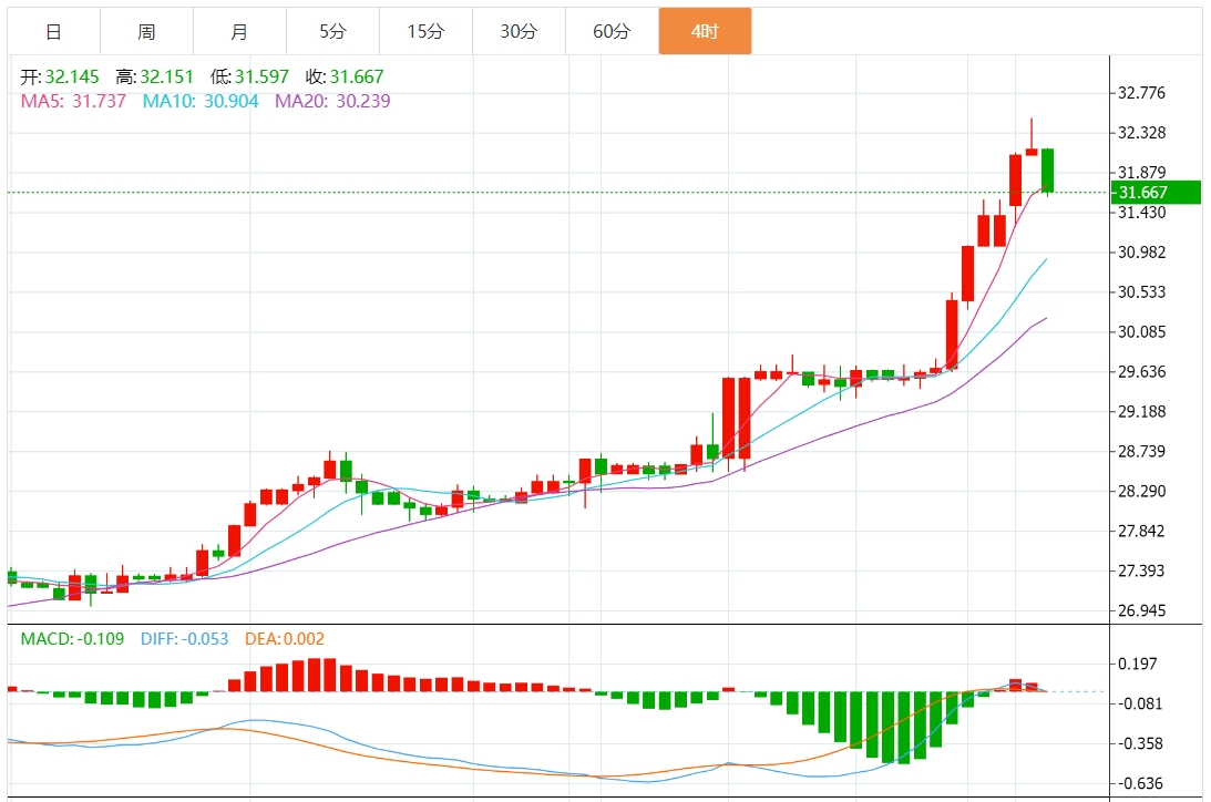 周一欧盘,白银价格进一步上涨,盘中突破32美元关口,截止发稿,白银价格高位回落,交投于31.94附近,美联储官员晚些时候的讲话,可能会提供对未来货币政策的见解。 中东地缘局势不稳定继续支撑金价,伊朗国家电视台报道称,载有总统易卜拉欣·莱西的直升机坠毁现场没有生命迹象,这加剧了中东的紧张局势。这一事件,加