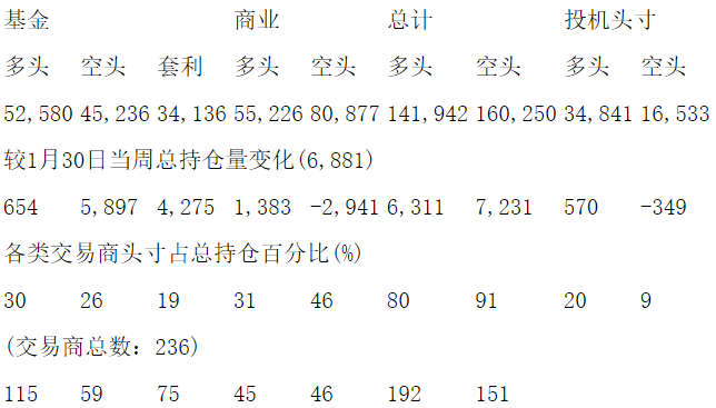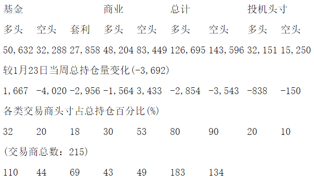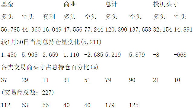 美国商品期货交易委员会(CFTC)最新公布截止1月30日当周COX白银期货和期权分类持仓报告: 合约单位:5000金衡盎司总持仓量:158846