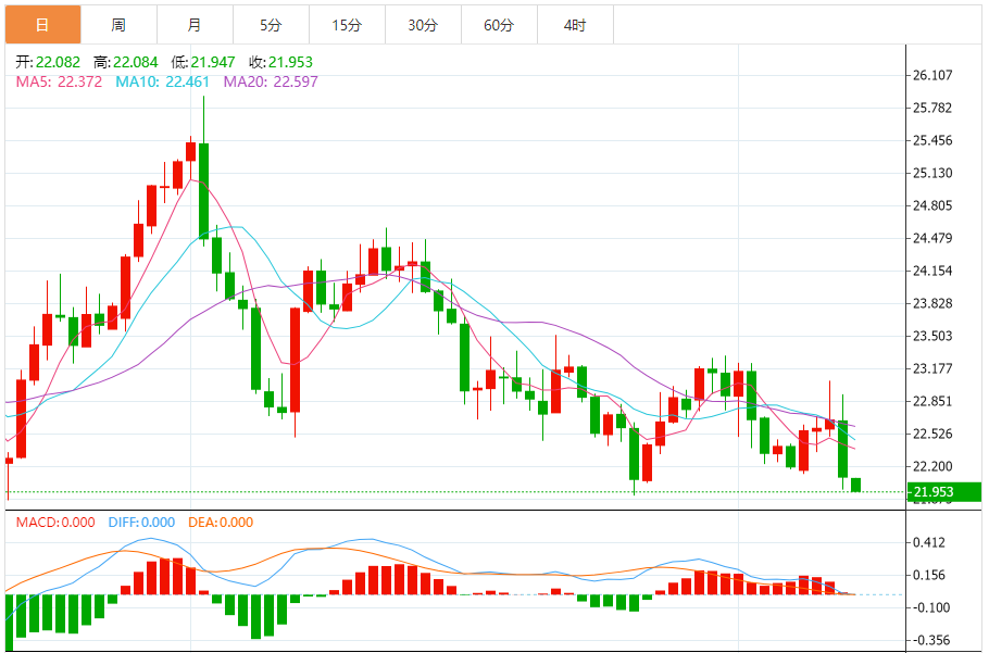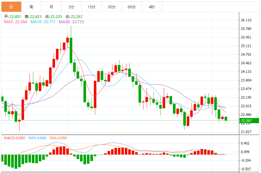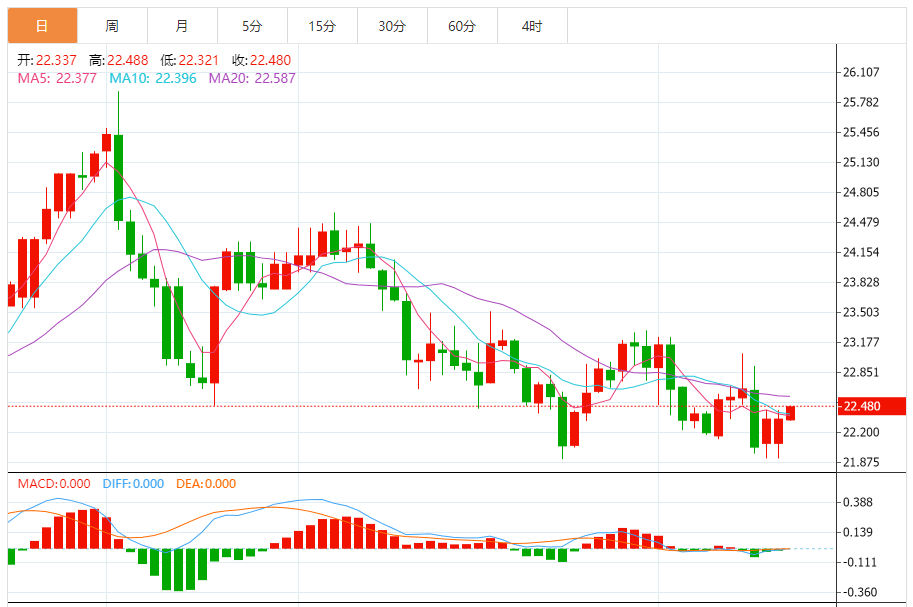 周三盘中,现货白银报22.003,跌幅0.42%。 今日分析:在22.35之下,看跌,目标价位为21.70,然后为21.50。 技术点评:RI技术指标运行趋势复杂,倾向于下跌。 支撑位:21.7021.5021.30 阻力位:22.7022.5422.35 (亚汇网编辑:冰凡)
