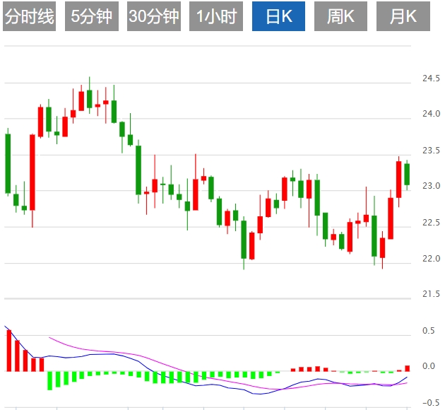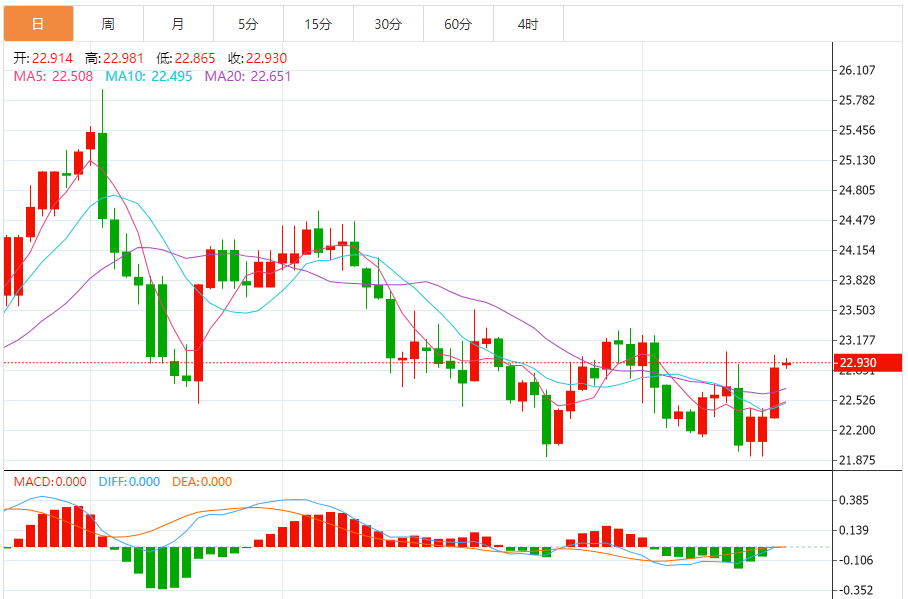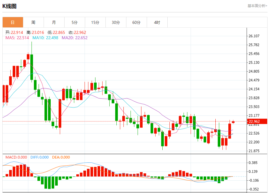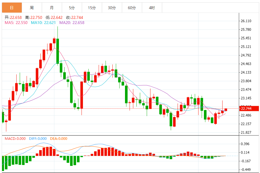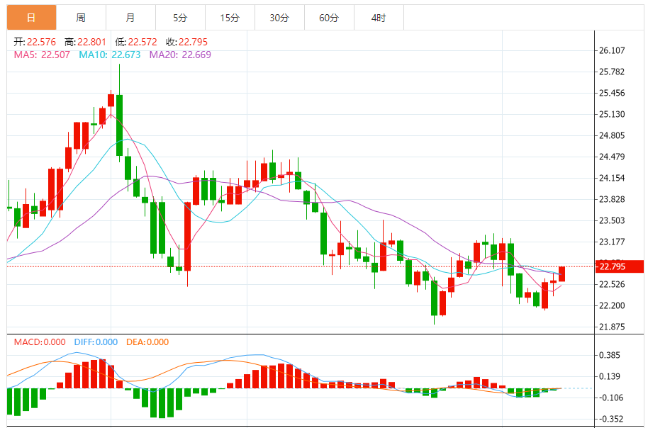 周五盘中,现货白银报22.572,涨幅0.06%。 今日分析:在22.45之上,看涨,目标价位为22.85,然后为23.00。 技术点评:在22.45之上,为多头信号,向上的目标位为22.85。 支撑位:22.4522.3022.12 阻力位:23.1523.0022.85 (亚汇网编辑:冰凡)