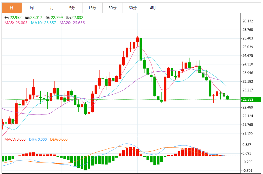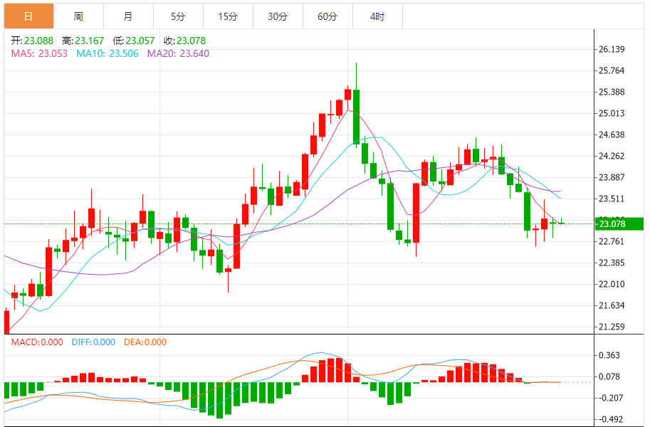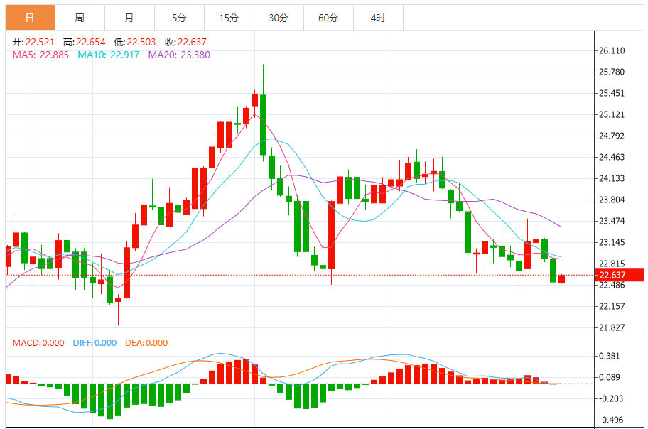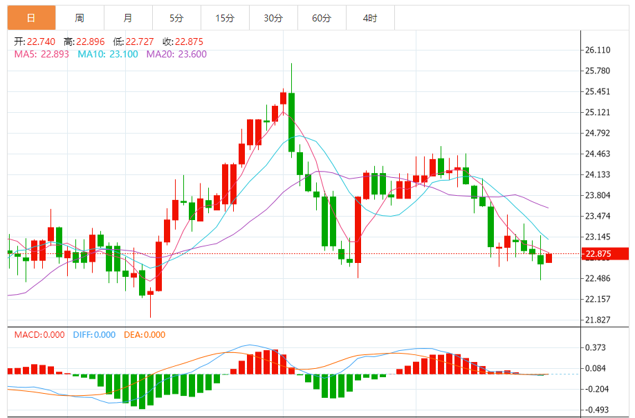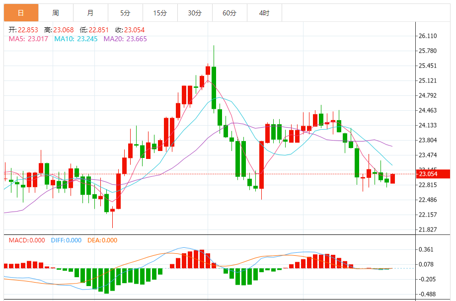 周一盘中,现货白银报22.905,跌幅1.10%。 今日分析:在23.06之下,看跌,目标价位为22.67,然后为22.50。 技术点评:RI技术指标看跌,有进一步下降空间。 支撑位:22.6722.5022.35 阻力位:23.3523.1923.06 (亚汇网编辑:冰凡)