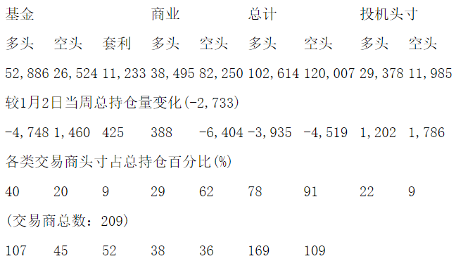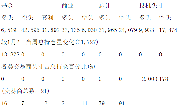 美国商品期货交易委员会(CFTC)最新公布截止1月9日当周COX白银期货分类持仓报告: 合约单位:5000金衡盎司总持仓量:131992
