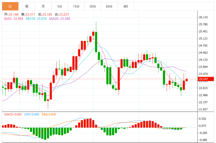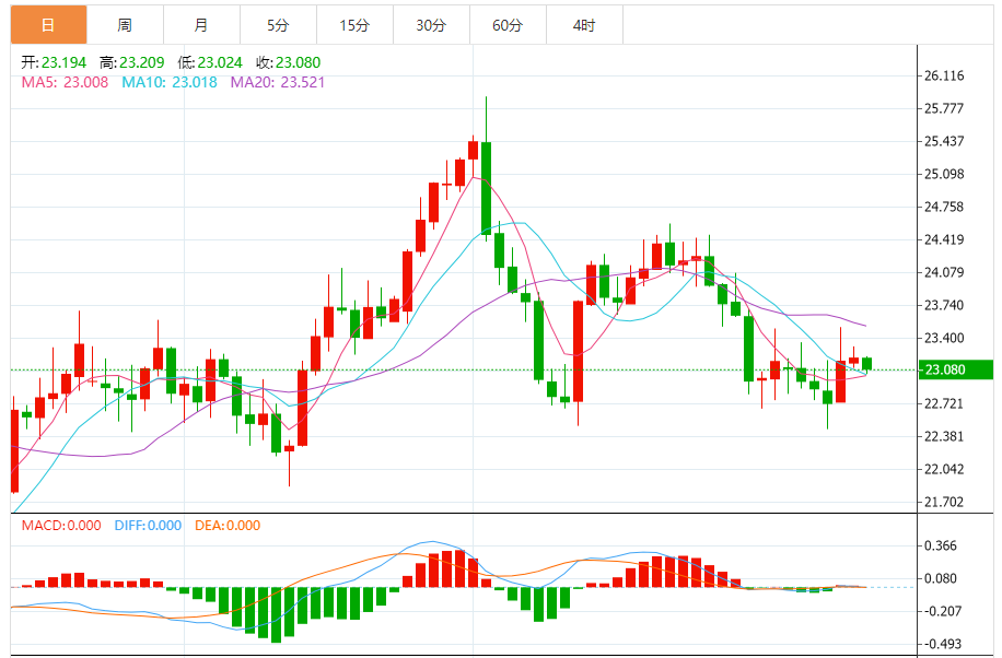 周二盘中,现货白银报23.063,跌幅0.57%。 今日分析:在23.24之下,看跌,目标价位为22.89,然后为22.77。 技术点评:RI技术指标运行趋势复杂,倾向于下降。 支撑位:22.8922.7722.64 阻力位:23.5223.4023.24 (亚汇网编辑:冰凡)