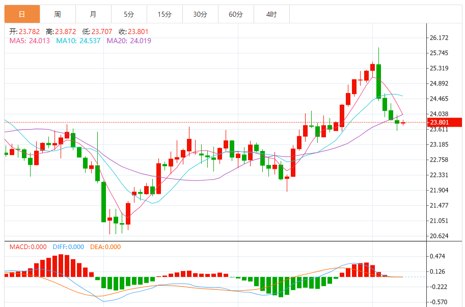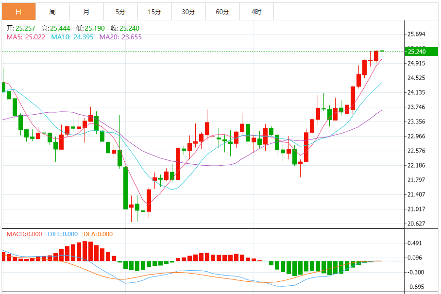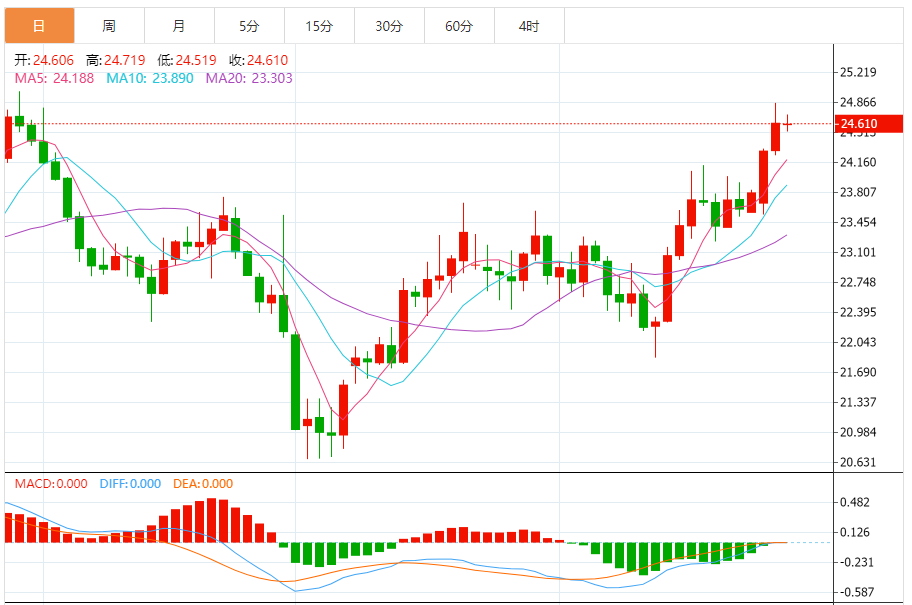 周四盘中,现货白银报25.051,涨幅0.22%。 今日分析:在24.80之上,看涨,目标价位为25.25,然后为25.45。 技术点评:24.80附近形成了一个支撑的底部,将带来走势短期内的稳定。 支撑位:24.8024.6524.50 阻力位:25.6025.4525.25 (亚汇网编辑:冰凡)