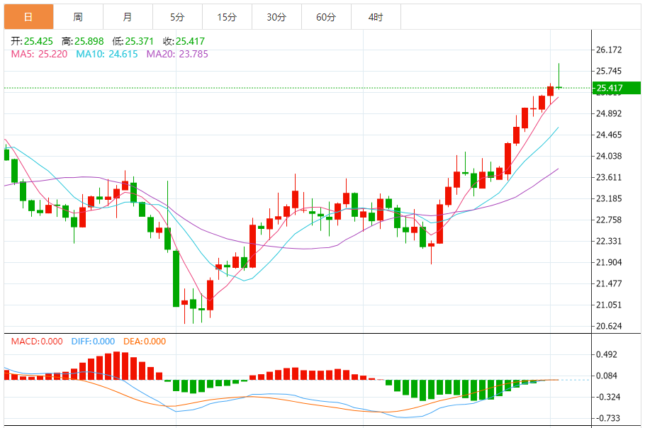 周一盘中,现货白银报25.292,跌幅0.56%。 今日分析:在25.40之下,看跌,目标价位为24.95,然后为24.83。 技术点评:跌破25.40,为空头信号,向下的目标将会是24.95。 支撑位:24.9524.8324.68 阻力位:25.8525.6025.40 (亚汇网编辑:冰凡)