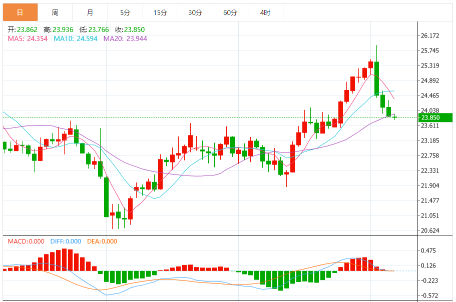 周三盘中,现货白银报24.234,涨幅0.41%。 今日分析:在24.35之下,看跌,目标价位为23.95,然后为23.80。 技术点评:RI技术指标看跌,有进一步下降空间。 支撑位:23.9523.8023.55 阻力位:24.8024.6024.35 (亚汇网编辑:冰凡)