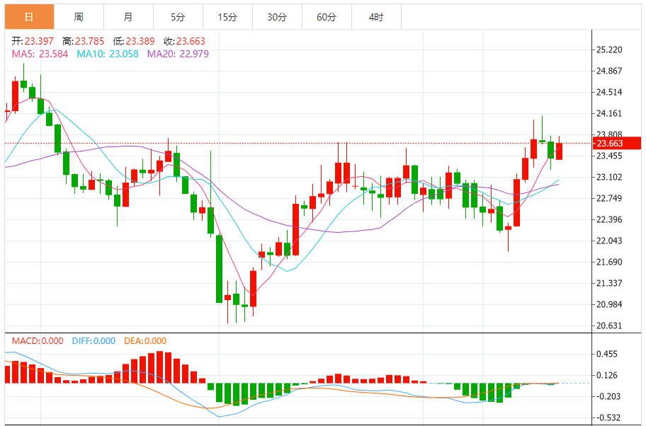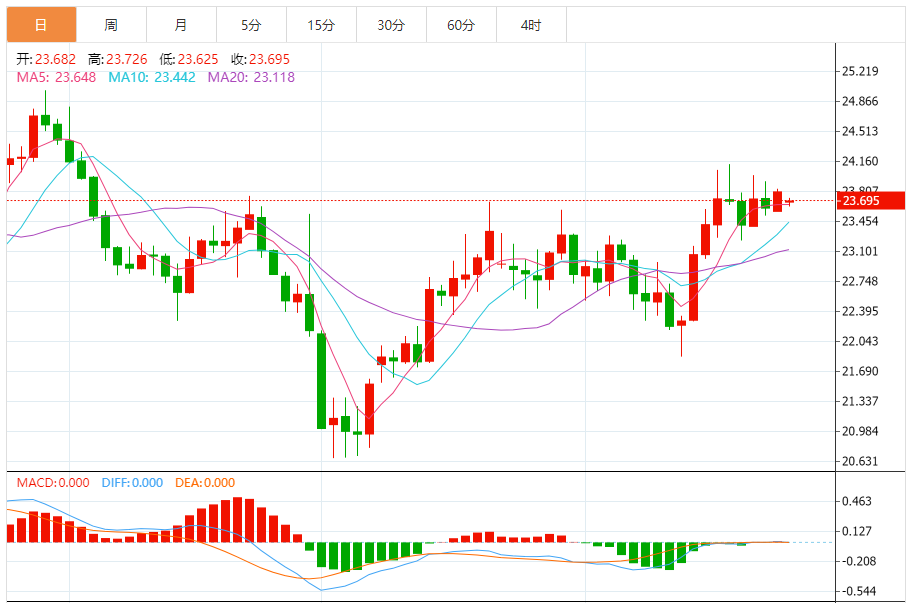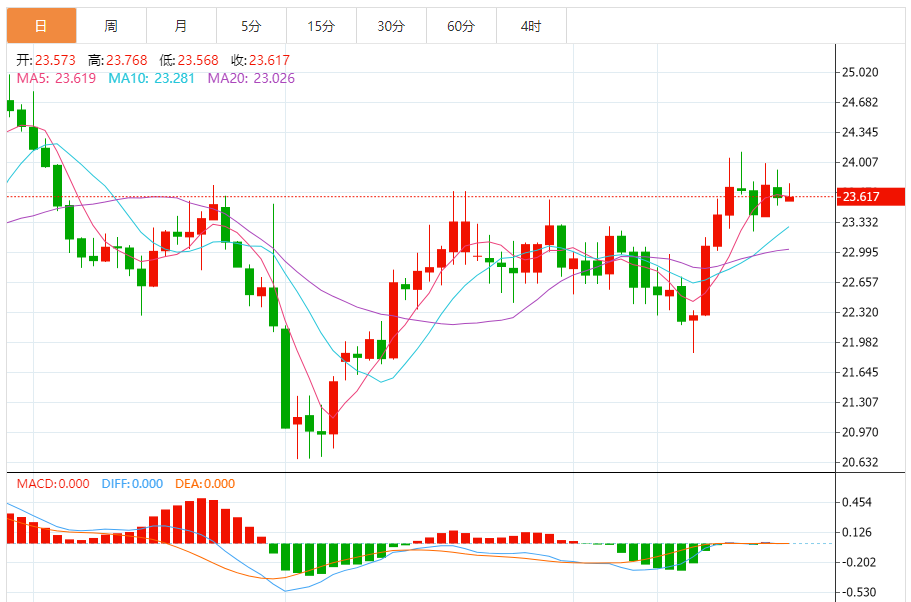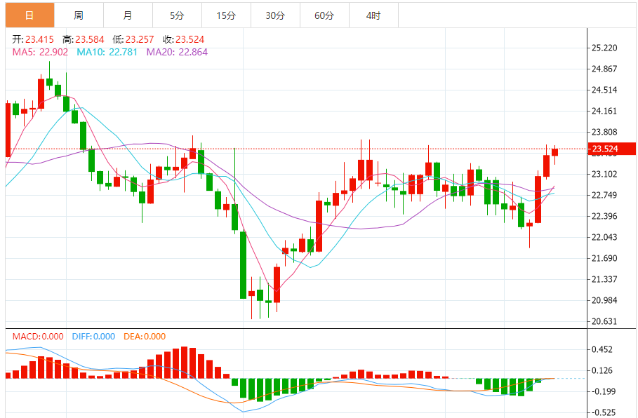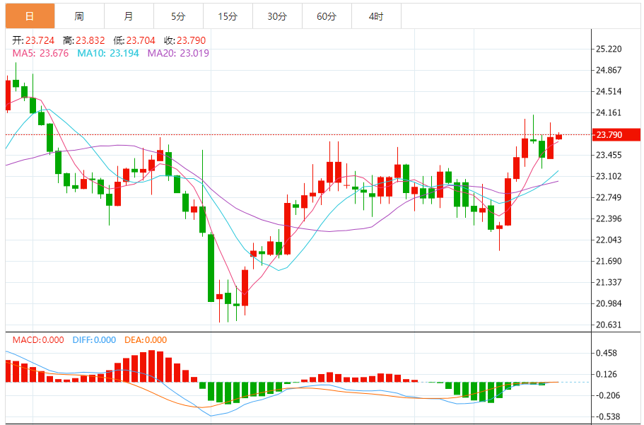 成交量低迷,白银价格周四上涨0.91%,随着亚太时段的开始,银价交投于23.82美元附近,在周五早盘时段保持不变,因为日本和美国市场在假期后重新开市。 白银日线图显示,银价呈中性偏向上行,但仍处于周内高点附近,这可能为测试24.00美元数字铺平道路。一旦突破该位,下一个阻力将是6月9日高点24.52美元,然后白银/美元
