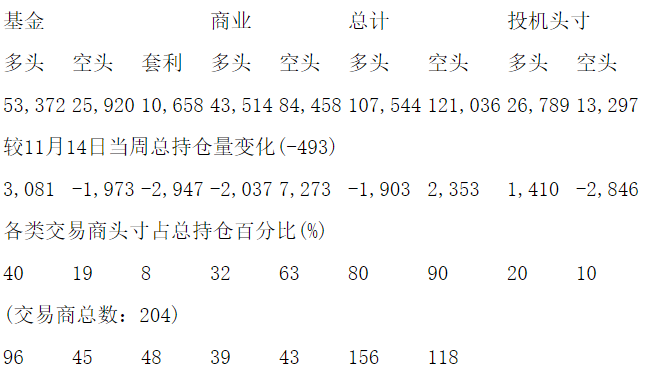 美国商品期货交易委员会(CFTC)最新公布截止11月21日当周COX白银期货分类持仓报告: 合约单位:5000金衡盎司总持仓量:134333