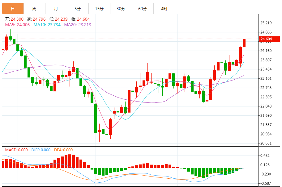 周一盘中,现货白银报24.847,涨幅2.28%。 今日分析:在24.40之上,看涨,目标价位为24.80,然后为25.00。 技术点评:在24.40之上,为多头信号,向上的目标位为24.80。 支撑位:24.4024.2524.00 阻力位:25.2525.0024.80 (亚汇网编辑:冰凡)