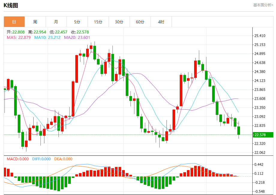 周四盘中,现货白银报22.429,跌幅1.67%。 今日分析:在22.80之下,看跌,目标价位为22.40,然后为22.20。 技术点评:跌破22.80,为空头信号,向下的目标将会是22.40。 支撑位:22.4022.2022.00 阻力位:23.1022.9522.80 (亚汇网编辑:冰凡)