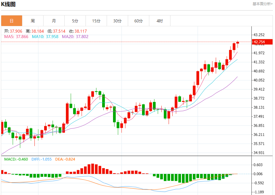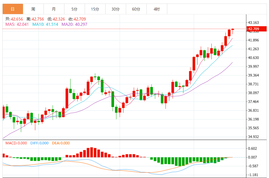 周二盘中,现货白银报42.750,涨幅0.23%。 今日分析:在42.32之上,看涨,目标价位为43.00,然后为43.20。 技术点评:RI技术指标运行趋势复杂,倾向于上升。 支撑位:42.3242.0041.75 阻力位:43.4043.2043.00 (亚汇网编辑:冰凡)