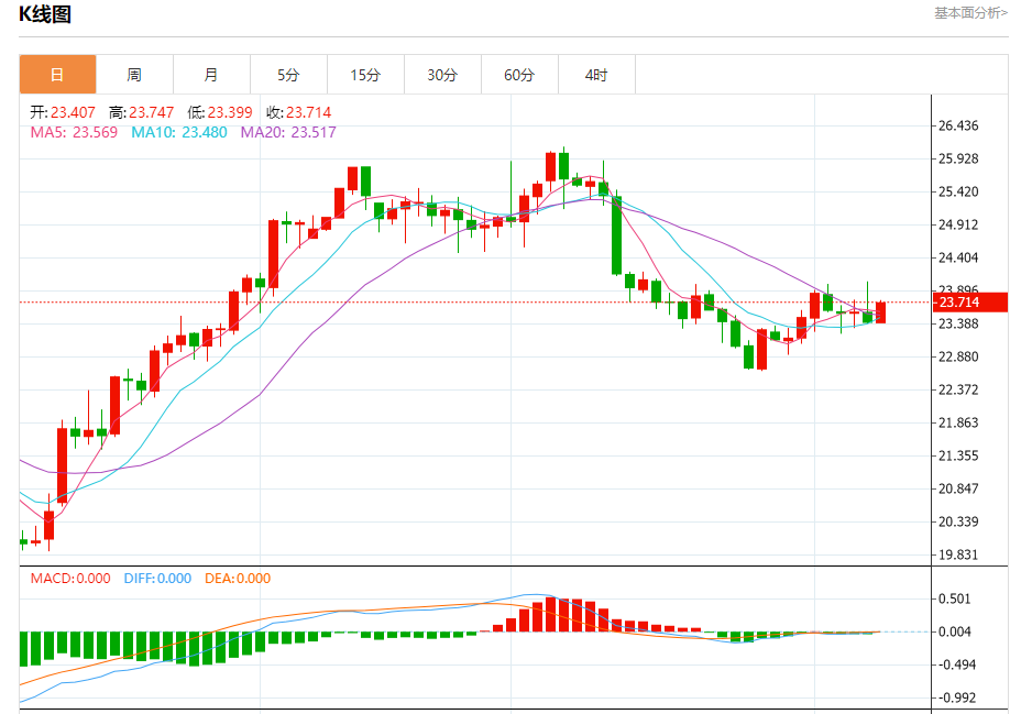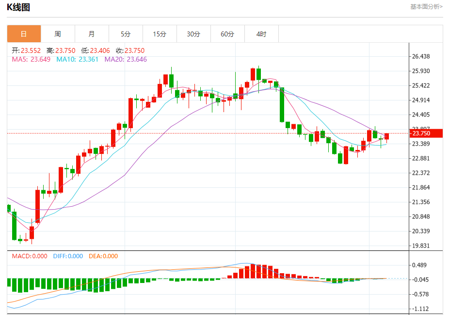基本消息面 周四(6月8日),现货白银延续日内强劲反弹走势,银价正接近重要水平23.70美元/盎司,日内大涨1%。 相关新闻消息 现货白银周三收市下挫0.65%,报23.43美元/盎司。 银价昨日一度尝试突破23.70美元/盎司,但维持在这一水平下方,这令看空趋势情景仍然有效。从4小时图来看,银价交投在50周期指数移动