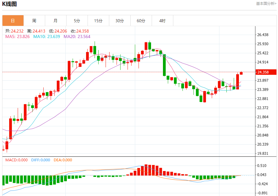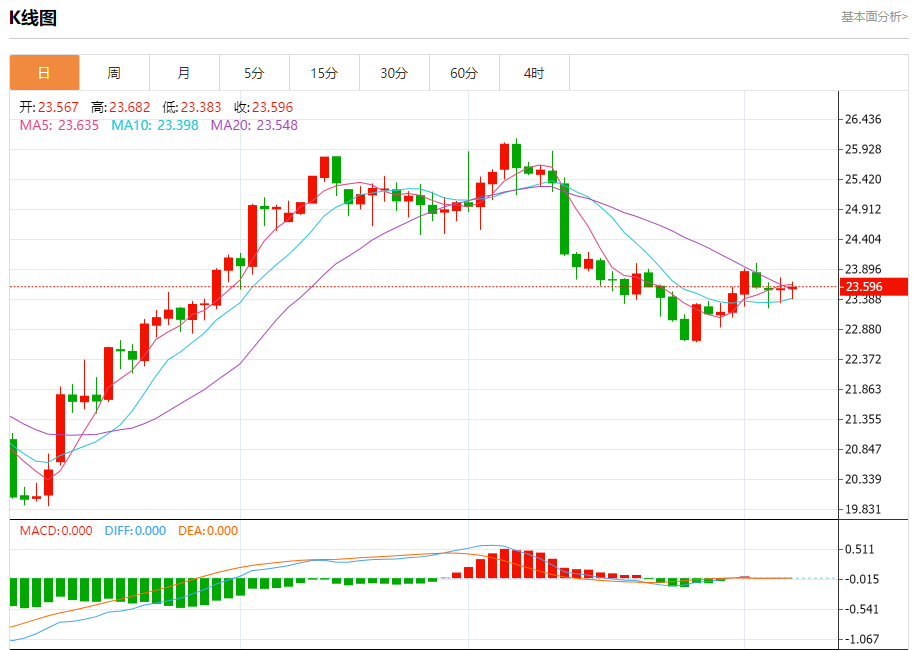 周三盘中,现货白银报23.534,跌幅0.15%。 今日分析:在23.32之上,看涨,目标价位为23.63,然后为23.77。 技术点评:RI技术指标运行趋势复杂,倾向于上涨。 支撑位:23.3223.2223.10 阻力位:23.9523.7723.63 (亚汇网编辑:冰凡)