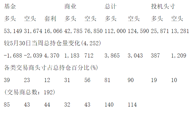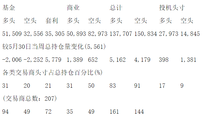 美国商品期货交易委员会(CFTC)最新公布截止6月6日当周COX白银期货分类持仓报告: 合约单位:5000金衡盎司总持仓量:137871